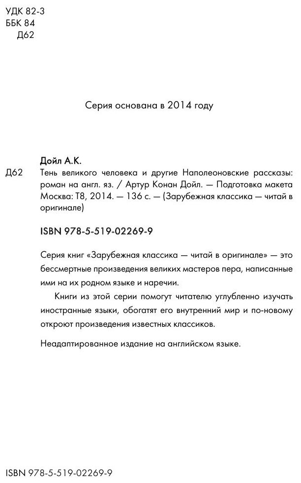 На сегодняшний день товар «Книга: The Great Shadow and Other Napoleonic Tales / Великая тень и другие наполеоновские сказки (Doyle Arthur Conan); Книга по Требованию, 2014» можно купить с кешбеком в 3 магазинах: book24, Буквоед, Читай-город