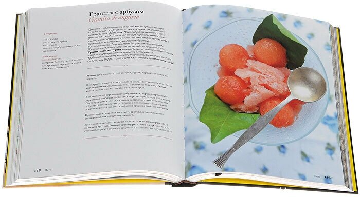 Как известно, в Италии великое множество всяких замысловатых и незамысловатых праздников, как то праздник лимона, лаванды, арбуза, спаржи, ириса, клубники и т.д., или праздник сбора пшеницы, фестиваль мороженого, праздник сыра, праздник цветочных ковров или ароматных трав, или торроне и кроккантино (итальянских сластей из орехов, меда или сахара), праздник тыквы, риса, грибов и сбора винограда. И, безусловно, Рождество, Пасха и другие традиционные итальянские праздники. Вот обо всем этом и есть книга. Разделена она на 4 части по сезонам, когда проходит каждый праздник. Для каждого праздника есть один или несколько рецептов, по большей части с использованием "праздничного" продукта (или просто традиционные для этого праздника блюда). Например, возьмем праздник клубники весной. Дается описание проведения этого праздника в разных регионах Италии (а их там действительно по-разному отмечают), приводятся советы по выбору клубники и два рецепта с использованием ароматной ягоды - панна-котта с клубникой и холодный крем с клубникой и рикоттой. Или возьмем посущественней... Праздник рыбы и морепродуктов. В Италии проводится огромное число праздников, посвященных рыбе и морепродуктам, "начиная от ракушек вонголе и заканчивая осетриной из реки По", но самые известные праздники, посвященные рыбе в целом проходят в небольших городках в Лацио, Тоскане, Лигурии, Марке и Сицилии. Даны рецепты маринованной форели, пастиччо из рыбы и морепродуктов (венецианская лазанья), ризотто с морепродуктами, дорады в кулечке и рыбы-меч в ароматном соусе. К каждому рецепту обязательно есть фото. Пошаговых фото мало, но, собственно, они там, где надо - к рецептам пасты или сложных блюд: тортелли с картофелем и сыром, карнавальные равиоли, панеттоне (традиционный рождественский кекс), лазанья алла болоньезе и другим, да и то, не столько пошаговые фото, сколько иллюстрации, чтоб было понятно, как должно выглядеть тесто, как его раскатать и нарезать. Таких рецептов, чтоб было сложно приготовить в российских условиях в виду отсутствия тех или иных продуктов, весьма мало, так что книгой можно пользоваться.