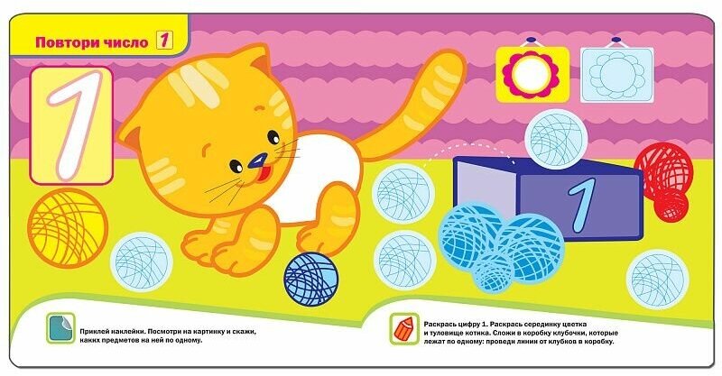 Книга с заданиями на закрепление темы счета для самых малышей. Листы в книге плотные и гладкие. Наклейки можно переклеить несколько раз. Много заданий на раскрашивание частично заполненных рисунков. Есть лист с наклейками , которые предлагается наклеить на указанные места.