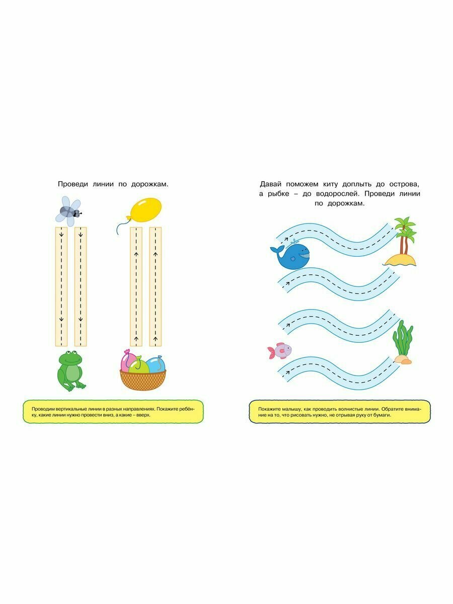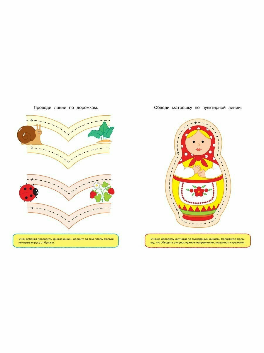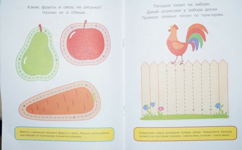 Книжечка очень тоненькая, что в принципе за такие деньги - ожидаемо. Но страницы довольно плотные и яркие, ребенку понравилось. Задания довольно простые для взрослого - проведи линию от и до или обведи что-то и потом нарисуй похожее, но для ребенка 1 года все же немного сложноватые.. Это скорее для ребенка 2х лет, поэтому мы пока откладываем и ждем, когда немного подрастем.