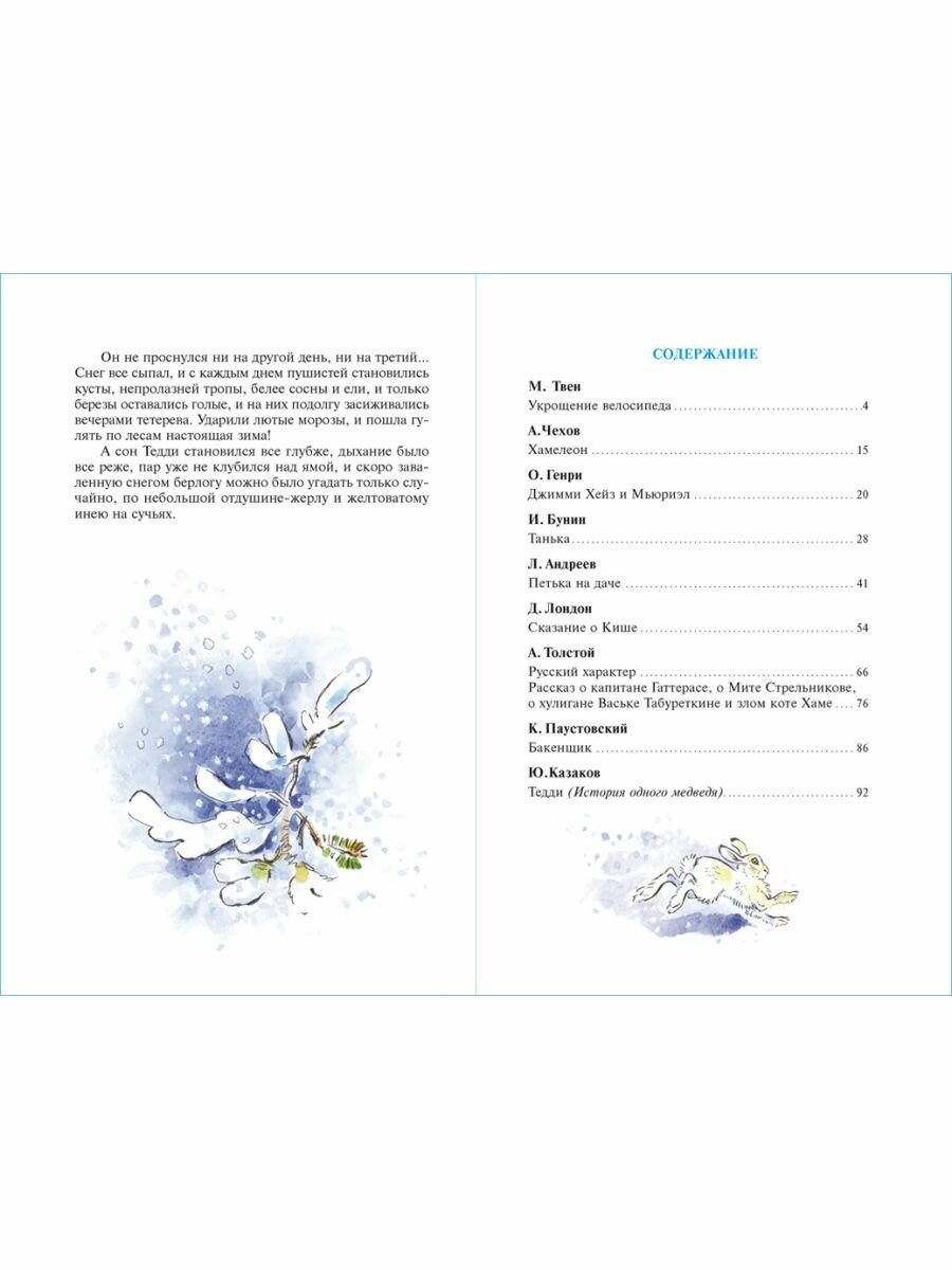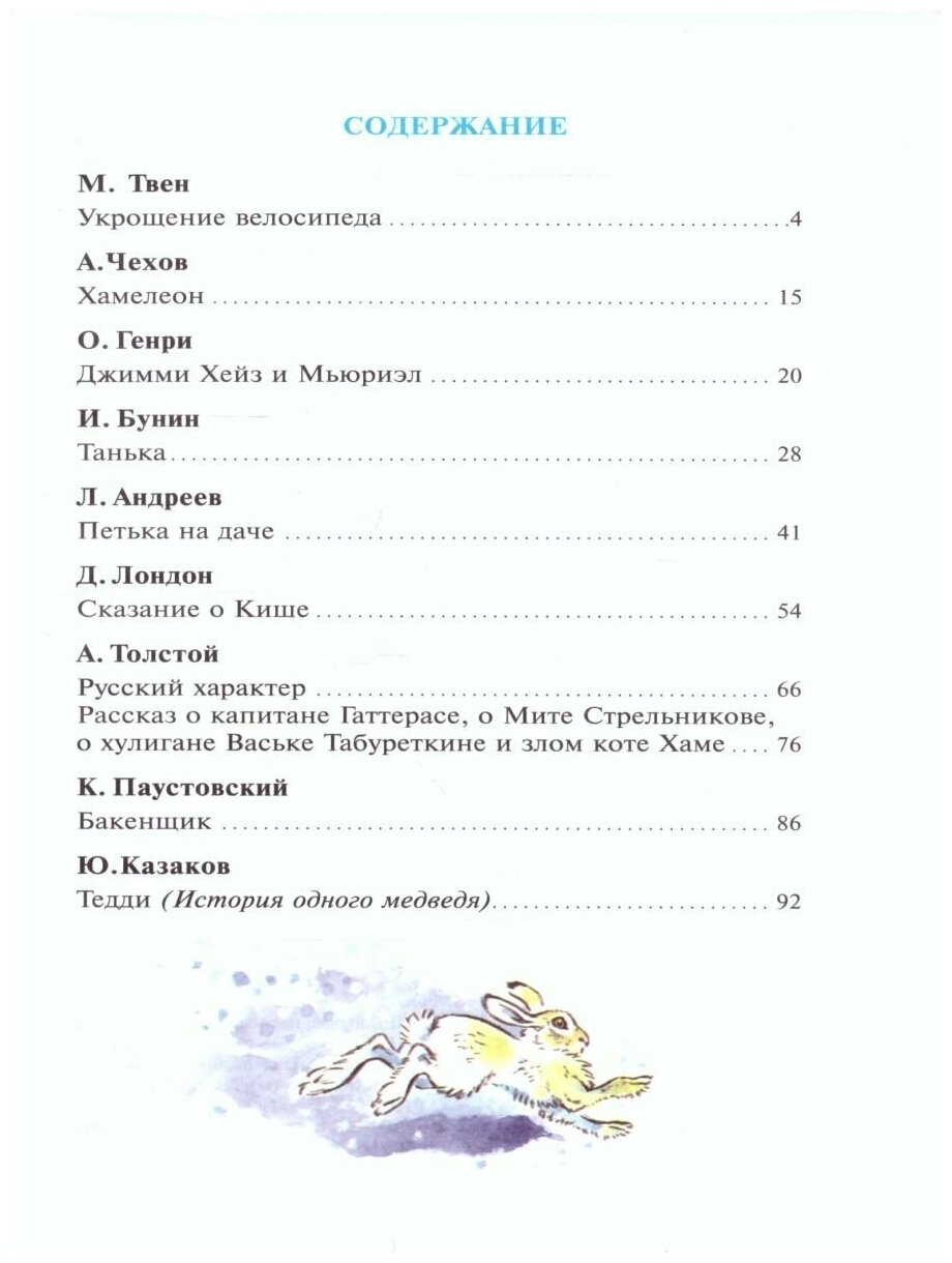 В книге есть: Укрощение велосипеда М. Твена, Хамелион А. Чехова, Чжимми Хейз и Мьюриэл О. Генри, Танька И. Бунина, Петька на даче Л. Андреева, Сказание о Кише Д. Лондона, Бакенщик К. Паустовского, Тедди Ю. Казакова, Русский характер, рассказ о капитане Геттерасе, о Мите Стрельникове, о хулигане Ваське Табуреткине и злом коте Хаме А. Толстого.