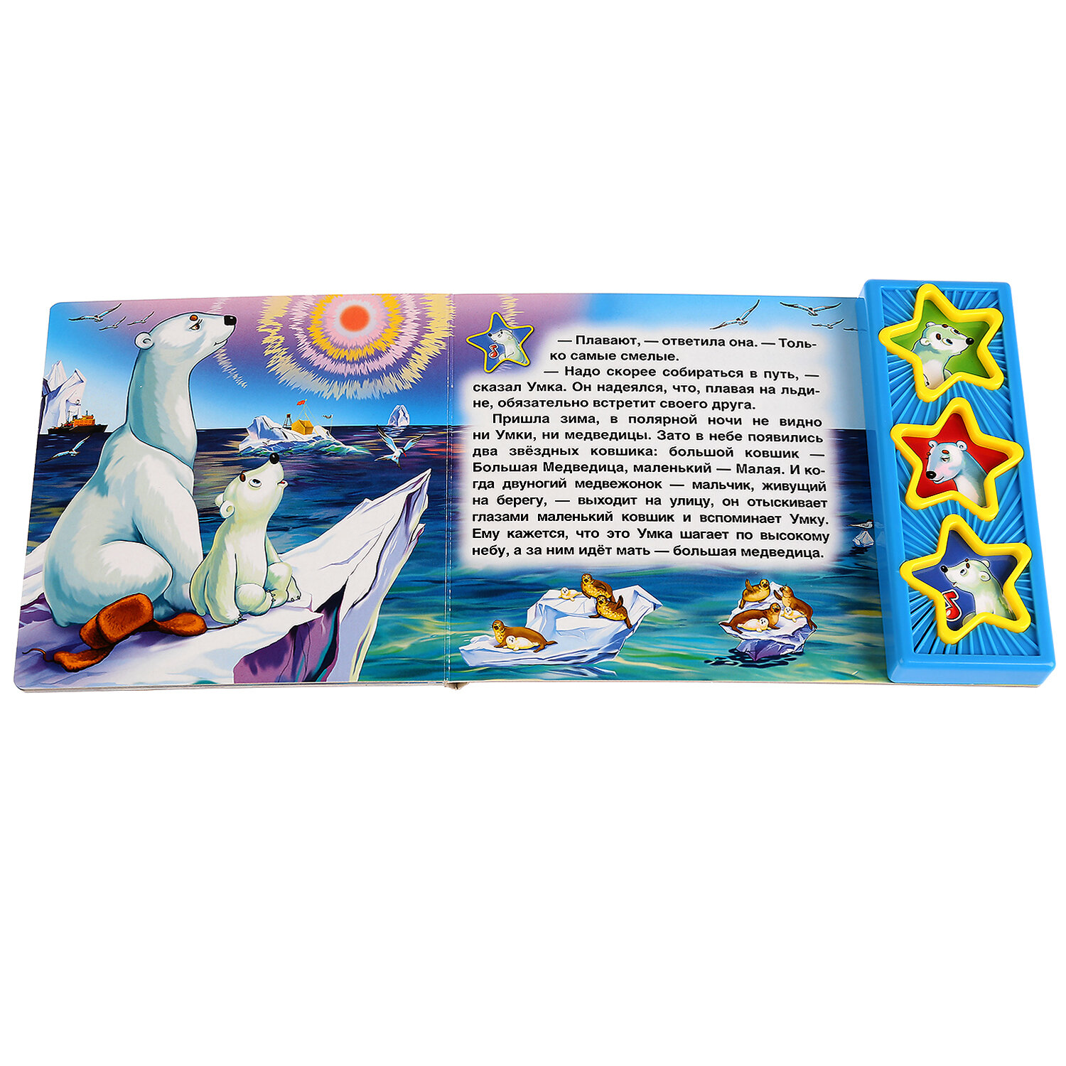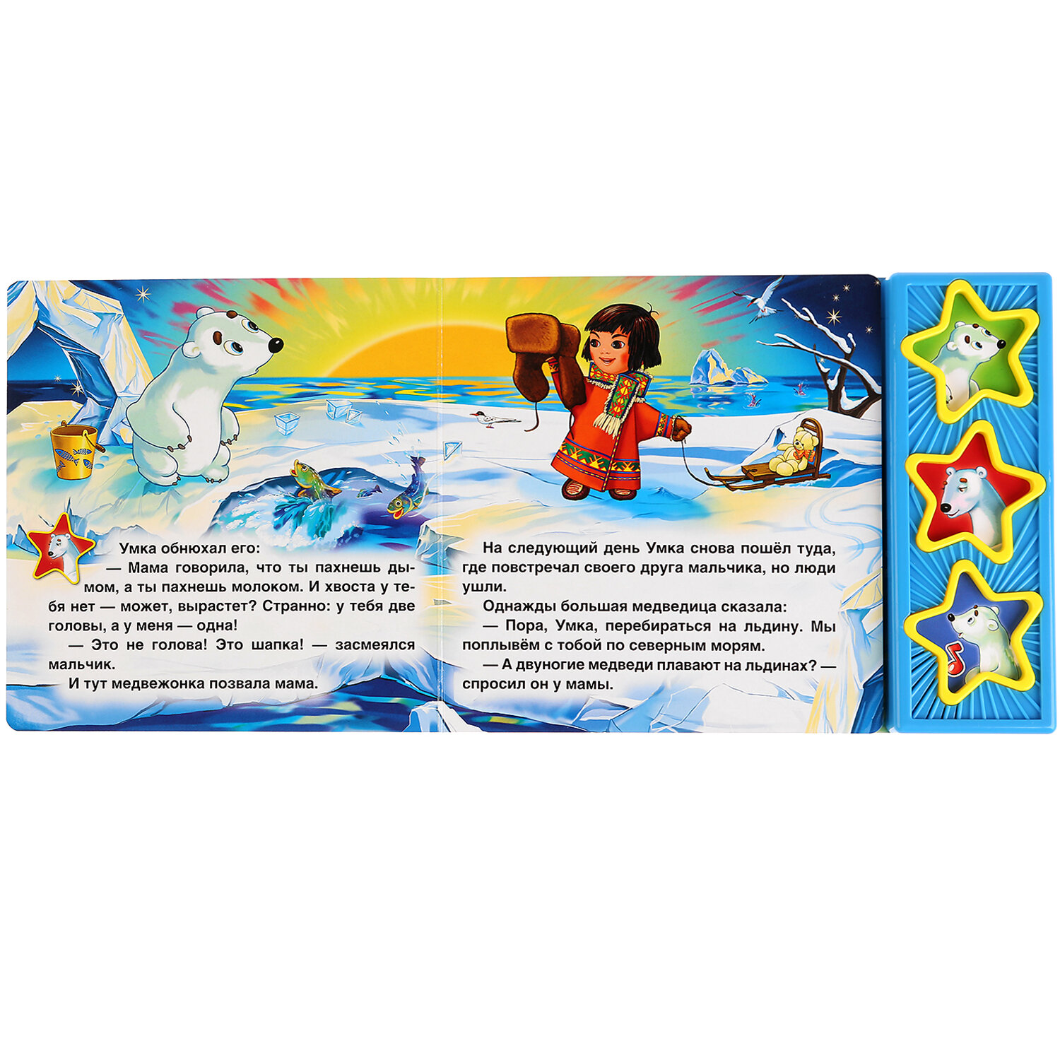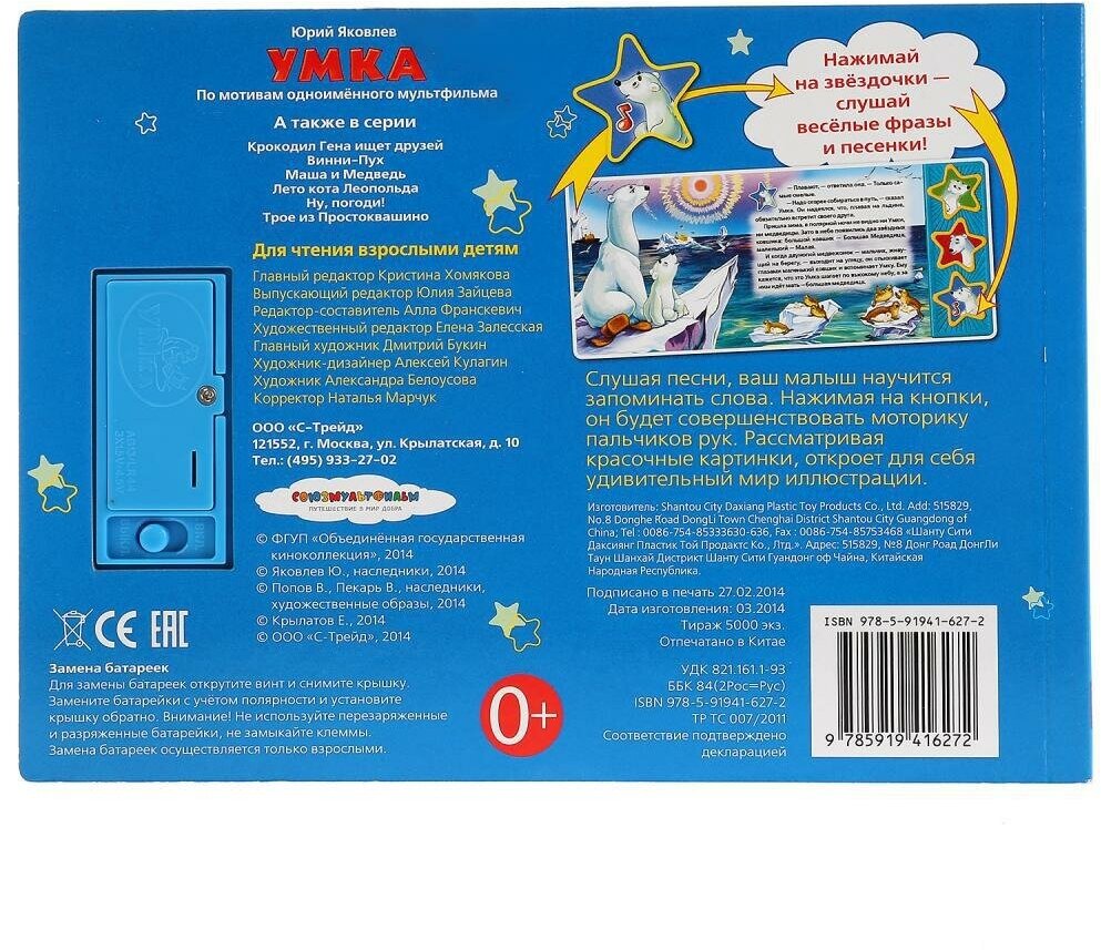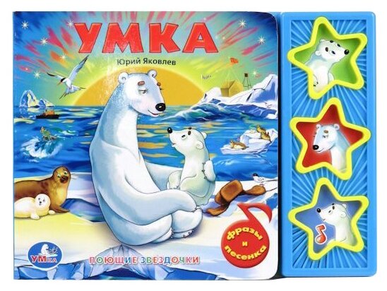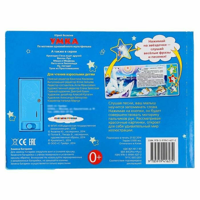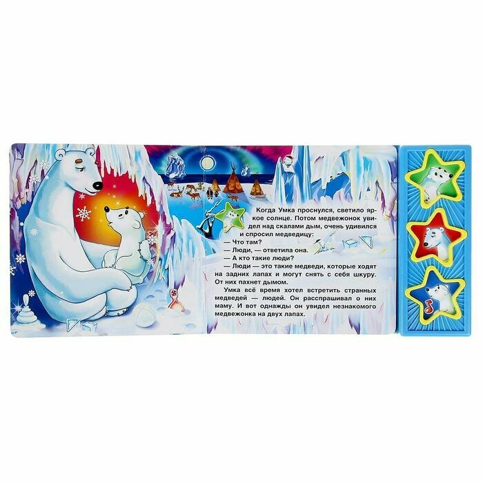 Книга имеет 3 звуковые кнопки: 2 фразы из мультфильма и колыбельная для "Умки". Книга является аналогом одноименного мультфильма. Все страницы книги выполнены из плотного картона, иллюстрированы яркими картинками и напоминают кадры мультфильма. Благодаря своему небольшому формату книгу можно будет брать с собой куда бы Вы не отправились. С правой стороны книги есть звуковой модуль с 3 кнопками в виде звездочек, украшенных картинками мультперсонажей. Нажимая кнопки ребенок может услышать фрагмент колыбельной медведицы или фразу одного из персонажей. При повторном нажатии на кнопку - звук прекращается. Книга поможет в развитии внимания, памяти, мелкой моторики, слухового и зрительного, а также эстетического восприятия ребенка.