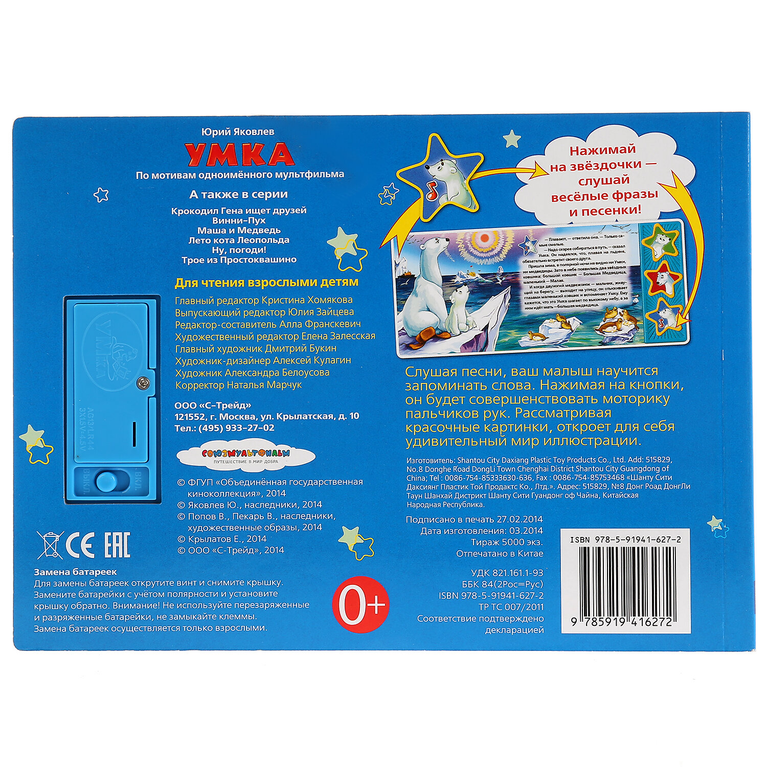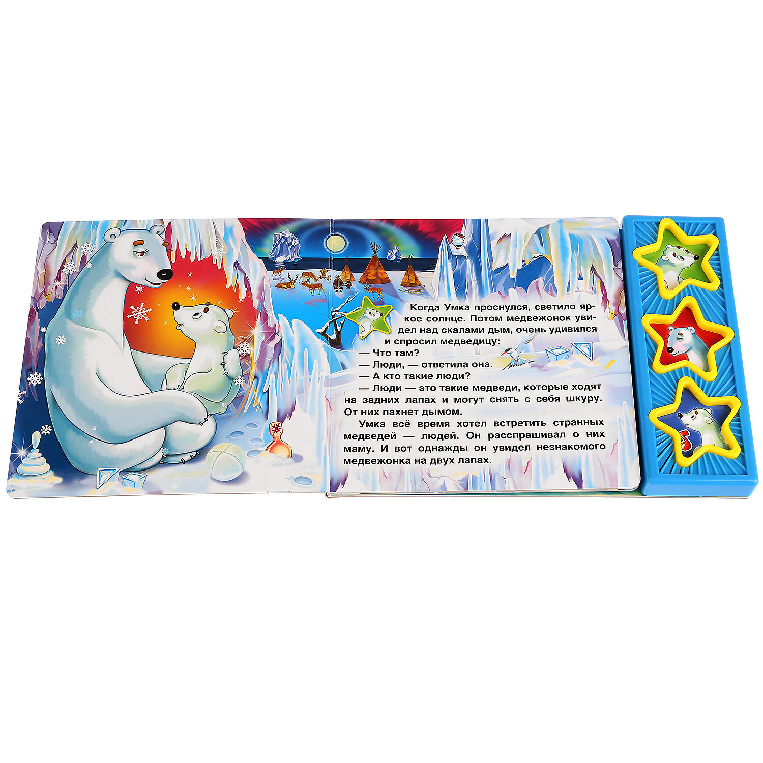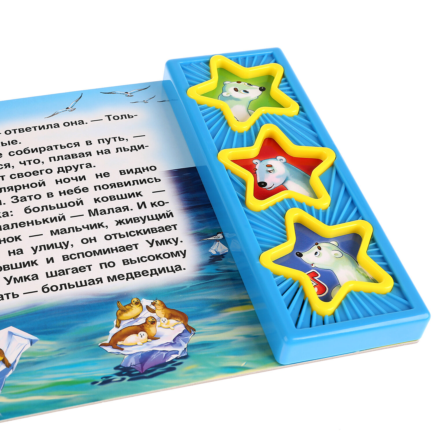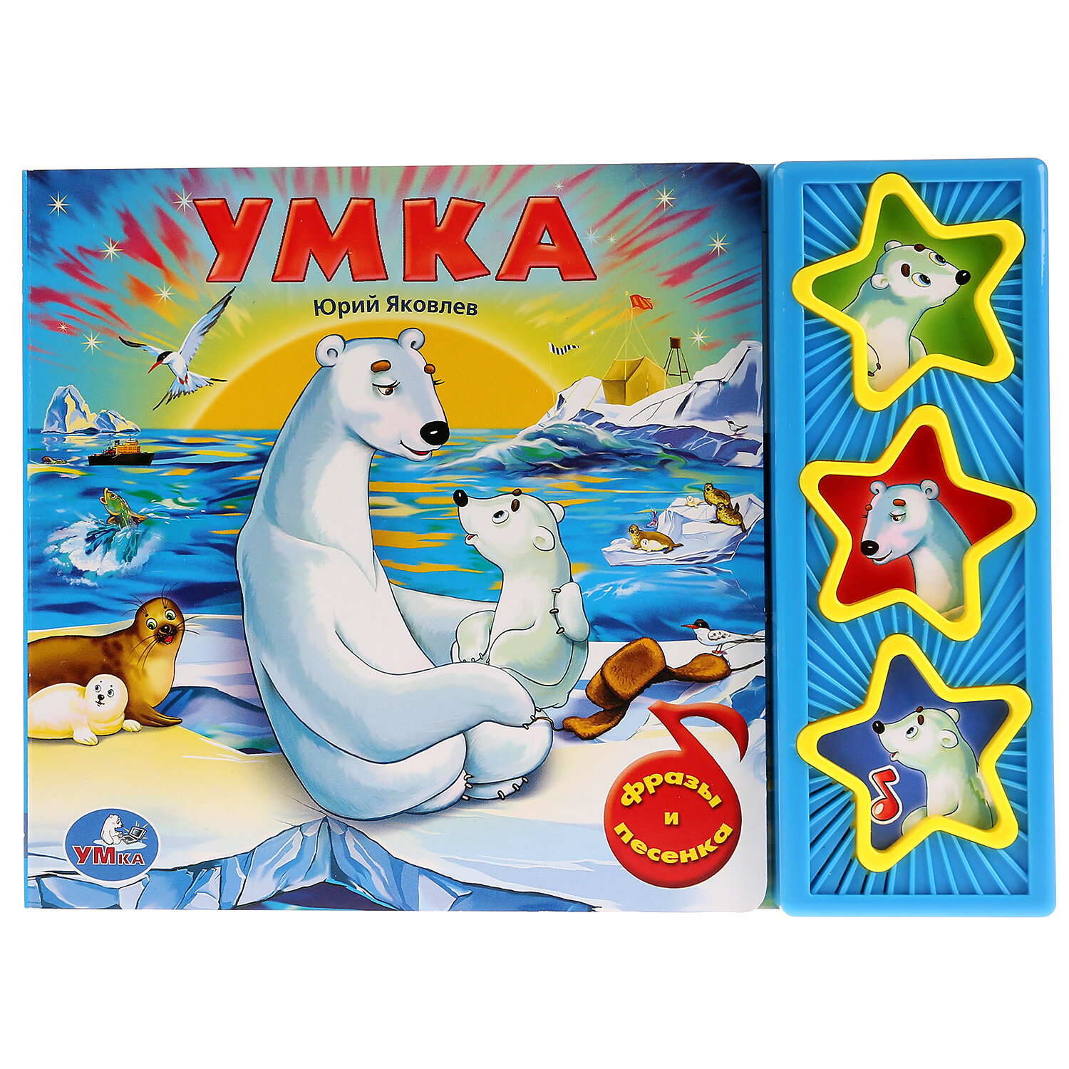 Книга имеет 3 звуковые кнопки: 2 фразы из мультфильма и колыбельная для "Умки". Книга является аналогом одноименного мультфильма. Все страницы книги выполнены из плотного картона, иллюстрированы яркими картинками и напоминают кадры мультфильма. Благодаря своему небольшому формату книгу можно будет брать с собой куда бы Вы не отправились. С правой стороны книги есть звуковой модуль с 3 кнопками в виде звездочек, украшенных картинками мультперсонажей. Нажимая кнопки ребенок может услышать фрагмент колыбельной медведицы или фразу одного из персонажей. При повторном нажатии на кнопку - звук прекращается. Книга поможет в развитии внимания, памяти, мелкой моторики, слухового и зрительного, а также эстетического восприятия ребенка.