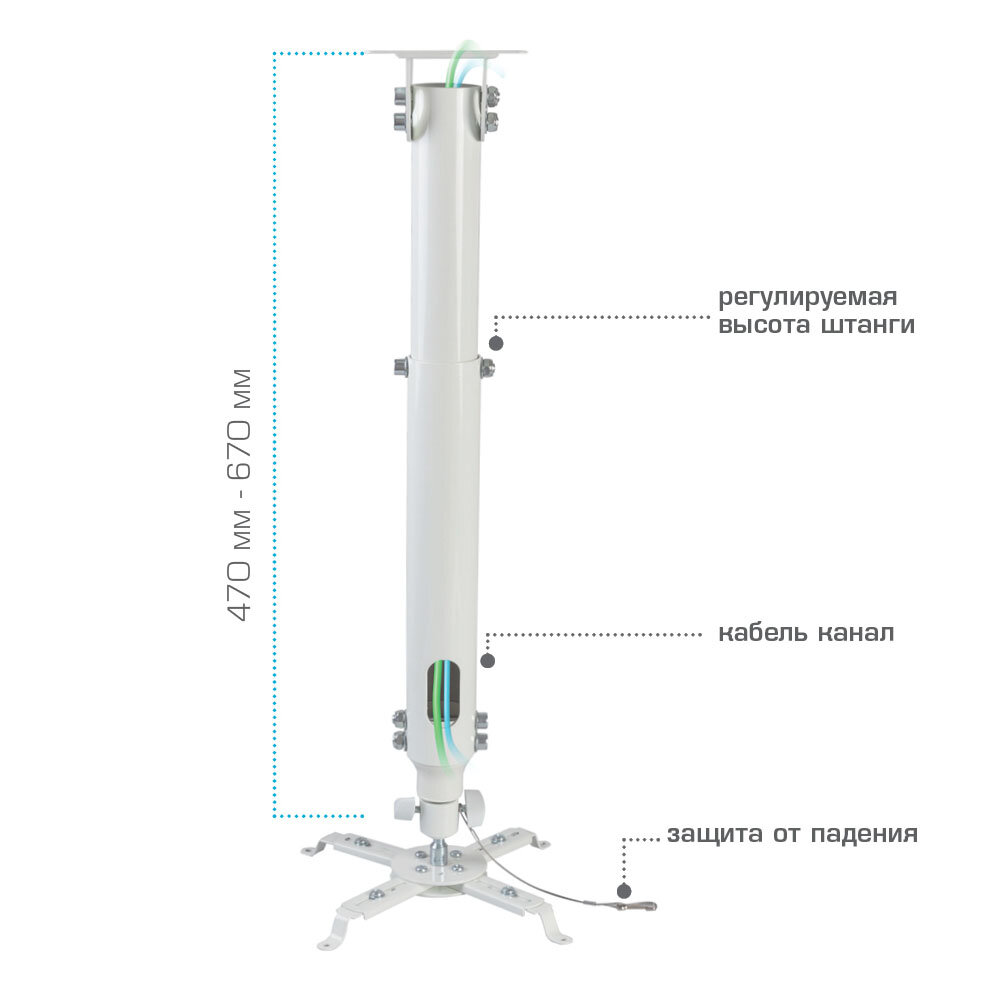 Надежный потолочный кронштейн для видео проекторов с удобной регулировкой наклона и поворота. Регулируемое расстояние от потолка до проектора 470-670 мм. Предусмотрена возможность укладки электропроводки внутри круглой штанги крепежа.