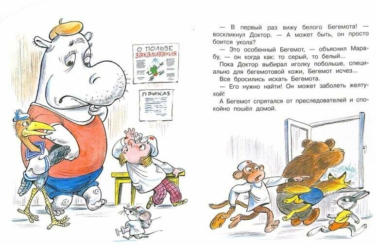 Симпатяга бегемот, такой большой и такой трусливый... Испугался, забоялся, попросту сбежал от чего бы вы думали - от прививки!!! Звери смеются, а бегемот то пожелтел - заболел наш бегемот, лежит теперь в постели и страдает... Забавная, очень смешливая история для детей. А если после прочтения посмотреть еще мультфильм с таким "харизматичным" бегемотом - удовольствие гарантированно!!!