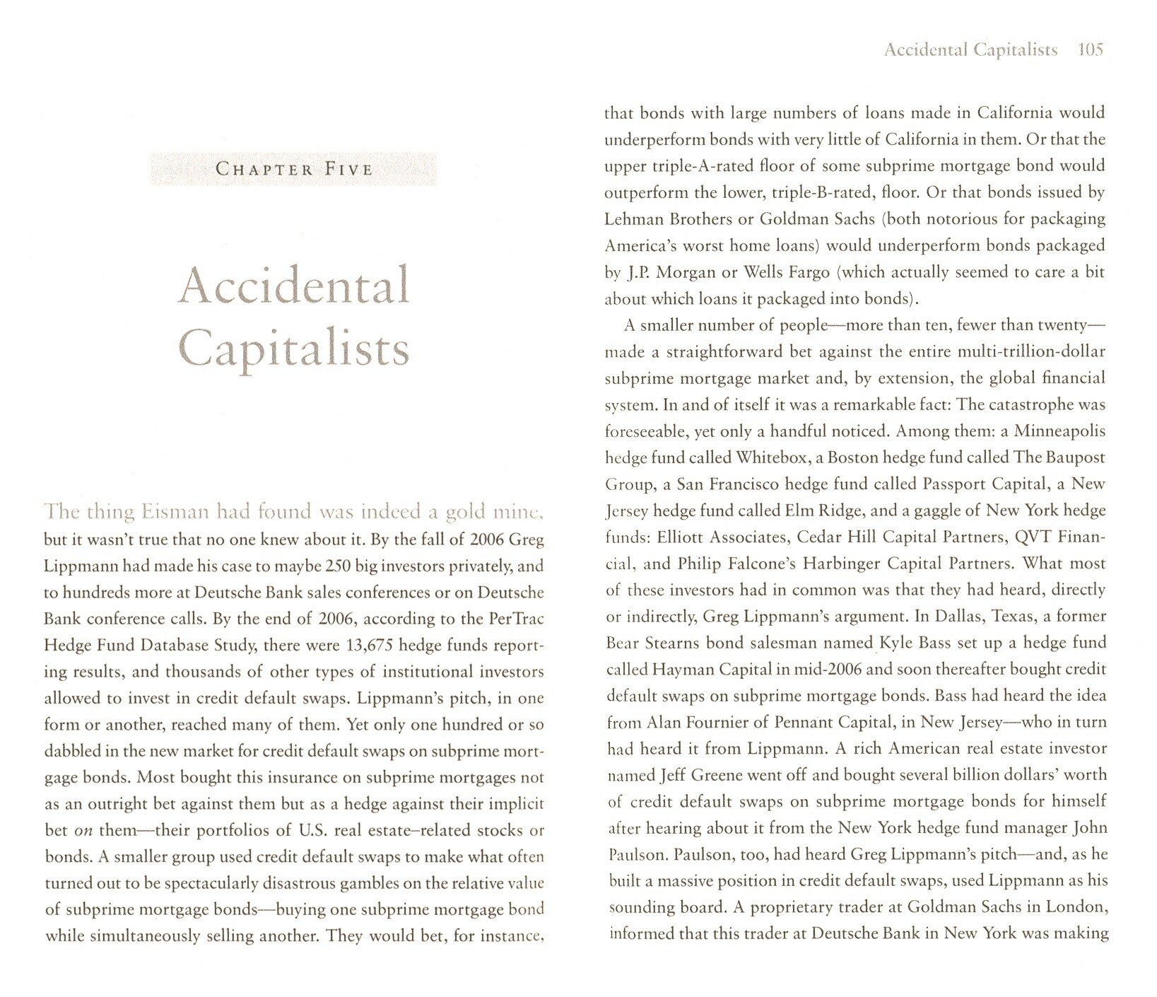 Книга довольно специфична и ввиду этого, насколько мне известно, не переводилась на русский. Однако всем самопровозглашенным "волкам с уолл-стрит" ее следовало бы прочесть. Автор подробно описывает финансовый крах 2008 года, раскрывая сложные концепции, такие как облигации субпрайм и CDO, в доступныой форме. Это словно триллер, который по ниточке распутывает причины кризиса: систему рейтинга, накопление долгов и банкротство, ипотечный пузырь - все то, что привело нас к крупнейшему экономическому спаду (правда, сейчас он еще больше из-за пандемии). Книга выдвигает идею о необходимости наказания вместо спасения подобных компаний правительством. Она подробно объясняет процесс создания и рейтинга ипотечных облигаций, а также выявляет недостатки в рейтинговой системе, которая не распознавала риски. Книга также подчеркивает главный урок - если что-то кажется слишком хорошим, чтобы быть правдой, вероятно, стоит поднапрячься и призадуматься.