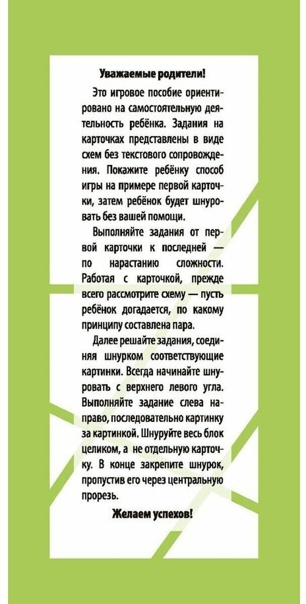 Учимся внимательно смотреть и образно мыслить" - это игровое пособие для развития внимания и пространственного и образного мышления. Пособие, ориентированное на самостоятельную деятельность ребёнка, представляет собой небольшой блокнот со шнурком, состоящий из 36 картонных карточек. Выполняя задания на карточках-страничках, ребёнок учится рассматривать предметы, мысленно конструировать и создавать образы. Проверить правильность своих ответов ребёнок сможет самостоятельно по линиям на оборотной стороне карточек. Простота и удобство пособия позволяют использовать его в детском саду, дома и на отдыхе. Предназначен для детей старше 5 лет. Крепление: спираль.