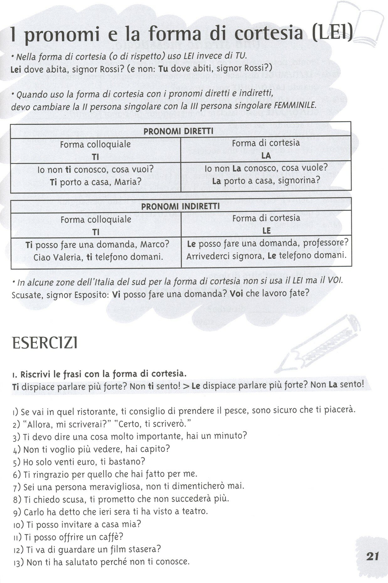 Questo libro unisce la chiarezza e la sistematicità della grammatica con l'utilità pratica dell'eserciziario. Contiene più di cento esercizi, giochi, attività e decine di schede per spiegare in modo semplice ed essenziale l'uso dei pronomi nella lingua italiana. Tutti gli argomenti, dai più semplici ai più complessi (pronomi diretti e indiretti, riflessivi, combinati, uso di ci e ne, imperativo con pronomi, verbi pronominali, pronomi personali soggetto, forme toniche e atone, dislocazioni pronominali), sono trattati con tabelle ed esempi chiari che presentano i casi più utili e frequenti; lo studio di ogni argomento è accompagnato da una grande varietà di esercizi, giochi, test e attività che permettono allo studente di fare pratica con l'uso dei pronomi in italiano. Per la sua gradualità nel presentare le forme linguistiche, il testo è adatto sia a studenti di livello elementare che di livello più avanzato. Per tutti gli esercizi sono fornite le soluzioni. L'insegnante troverà anche un'agile guida che lo indirizzerà nell'utilizzazione del libro in classe.