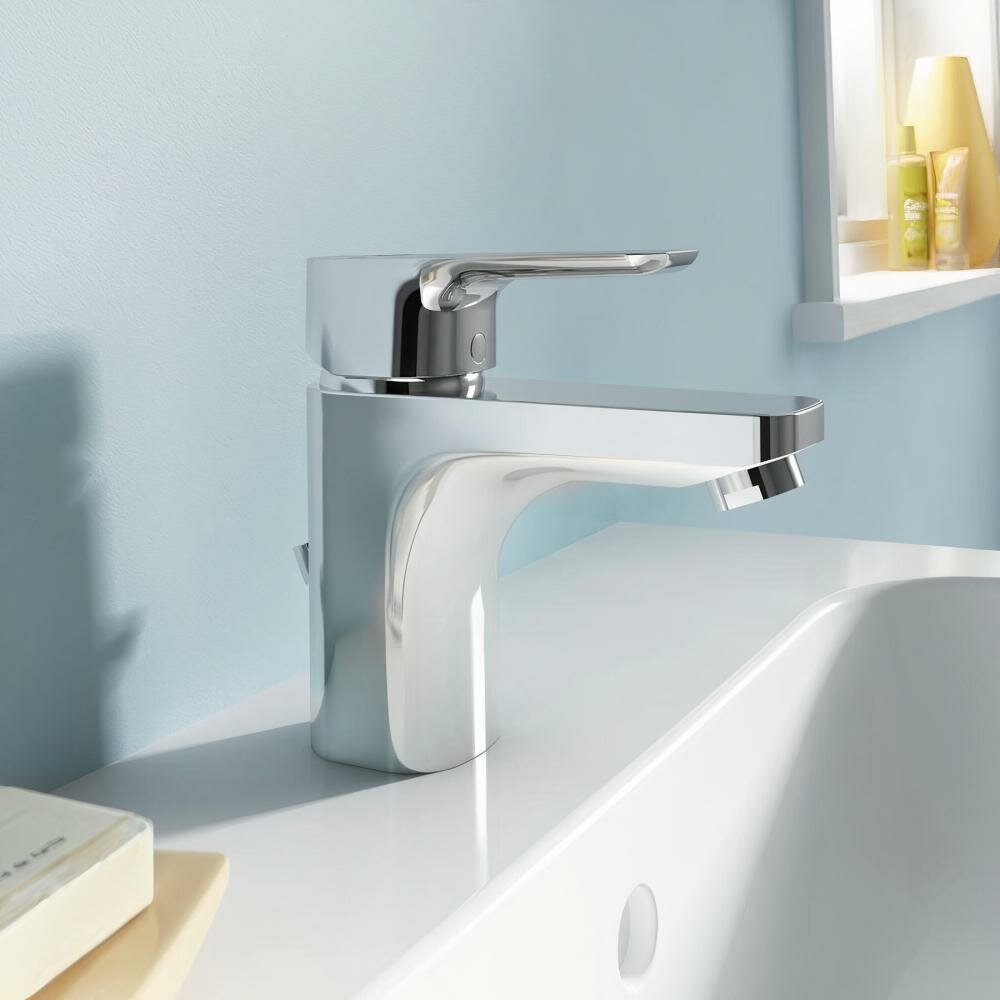 Однорычажный смеситель для раковины. Картридж 40 мм с функциями HWTC и CLICK. Гибкая подводка G3/8" (шланги PEX). Литой корпус с отверстием под стержень донного клапана. Металлический донный клапан. Металлическая рукоятка с индикатором горячей/холодной воды. Система монтажа EASY-FIX. Аэратор CASCADE M24 x1, class A. Цвет хром
