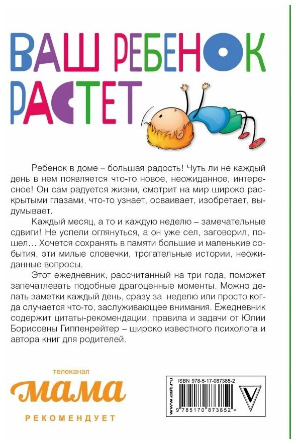 Этот ежедневник, рассчитанный на три года, поможет запечатлевать подобные драгоценные моменты. Можно делать заметки каждый день, сразу за неделю или просто когда случается что-то, заслуживающее внимания. Еженедельник содержит цитаты-рекомендации, правила и задачи от Юлии Борисовны Гиппенрейтер – широко известного психолога и автора книг для родителей.