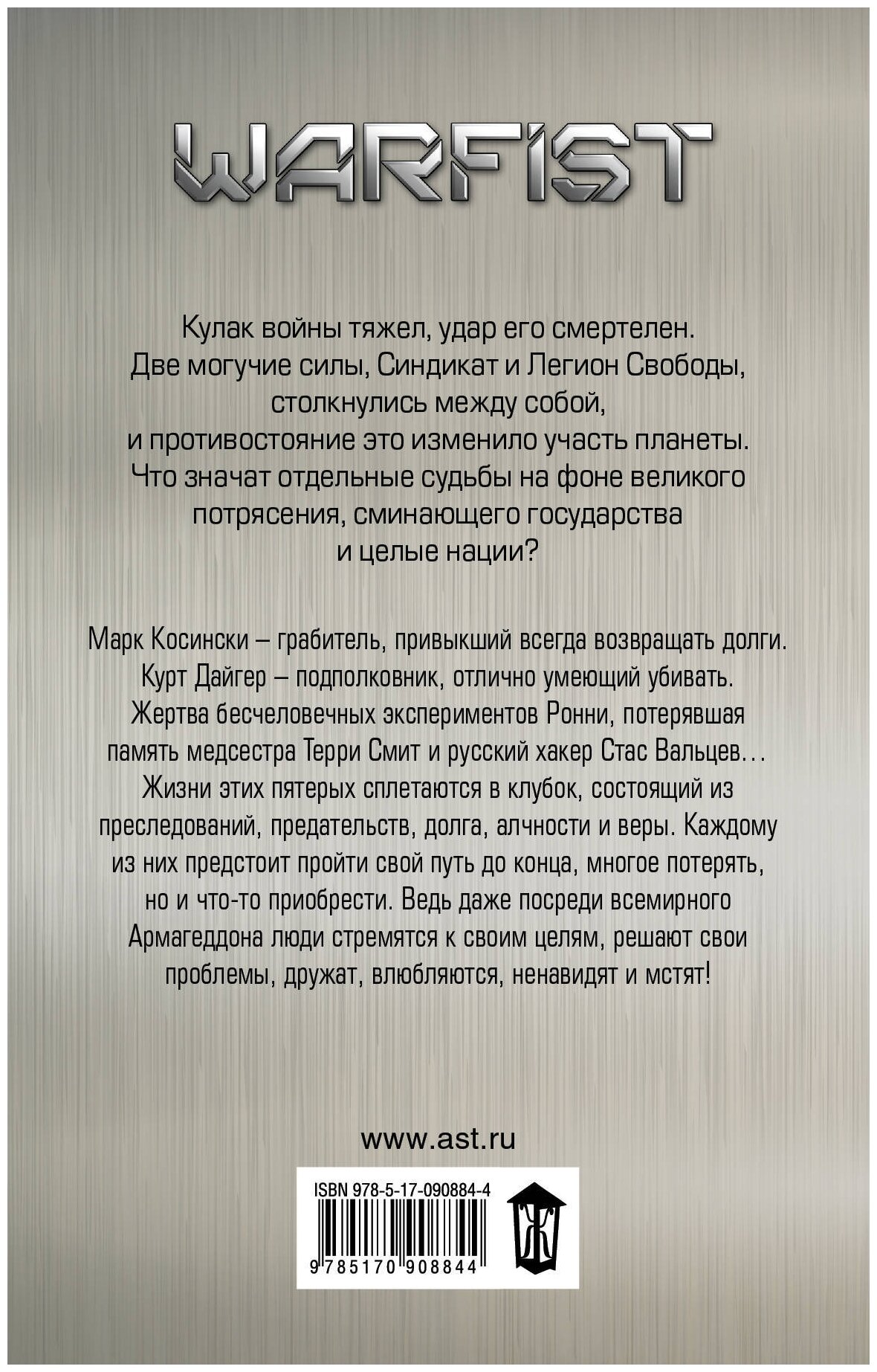 Кулак войны тяжел, удар его смертелен. Две могучие силы, Синдикат и Легион Свободы, столкнулись между собой, и противостояние это изменило участь планеты. Что значат отдельные судьбы на фоне великого потрясения, сминающего государства и целые нации? Марк Косински — грабитель, привыкший всегда возвращать долги. Курт Дайгер — подполковник, отлично умеющий убивать. Жертва бесчеловечных экспериментов Ронни, потерявшая память медсестра Терри Смит и русский хакер Стае Вальцев. Жизни этих пятерых сплетаются в клубок, состоящий из преследований, предательств, долга, алчности и веры. Каждому из них предстоит пройти свой путь до конца, многое потерять, но и что-то приобрести. Ведь даже посреди всемирного Армагеддона люди стремятся к своим целям, решают свои проблемы, дружат, влюбляются, ненавидят и мстят!