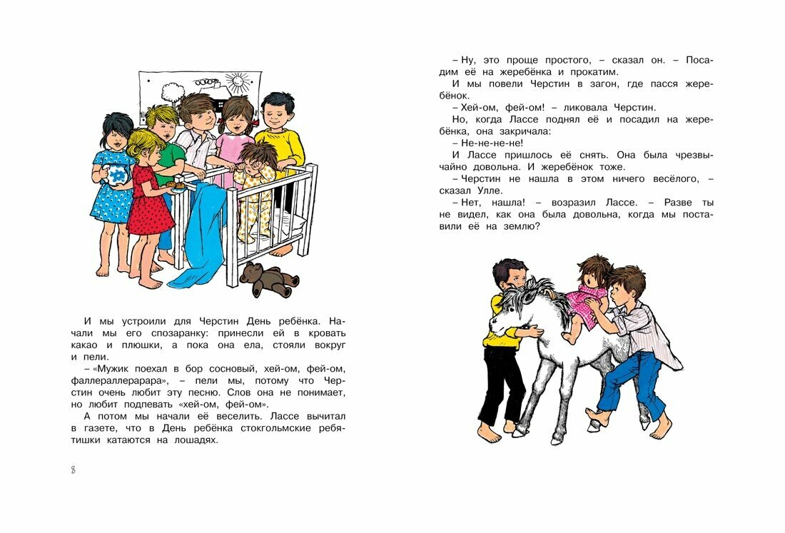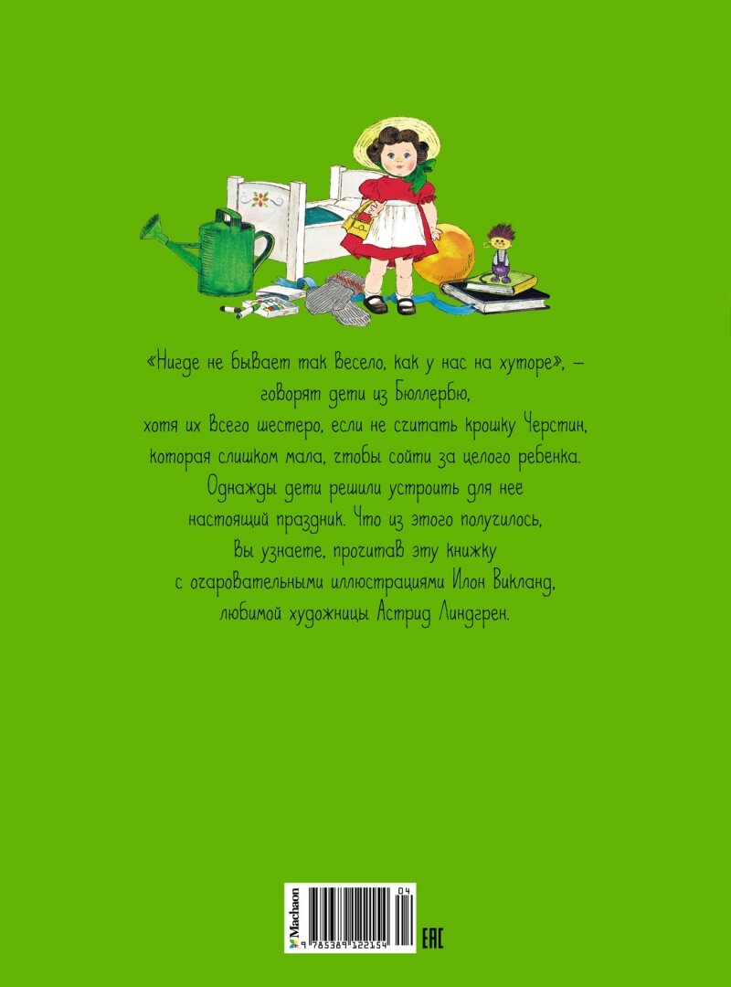 Махаон . «Нигде не бывает так весело, как у нас на хуторе», – говорят дети из Бюллербю, хотя их всего шестеро, если не считать крошку Черстин, которая слишком мала, чтобы сойти за целого ребёнка. Однажды дети решили устроить для неё настоящий праздник. Что из этого получилось, вы узнаете, прочитав эту книжку с очаровательными иллюстрациями Илон Викланд, любимой художницы Астрид Линдгрен.