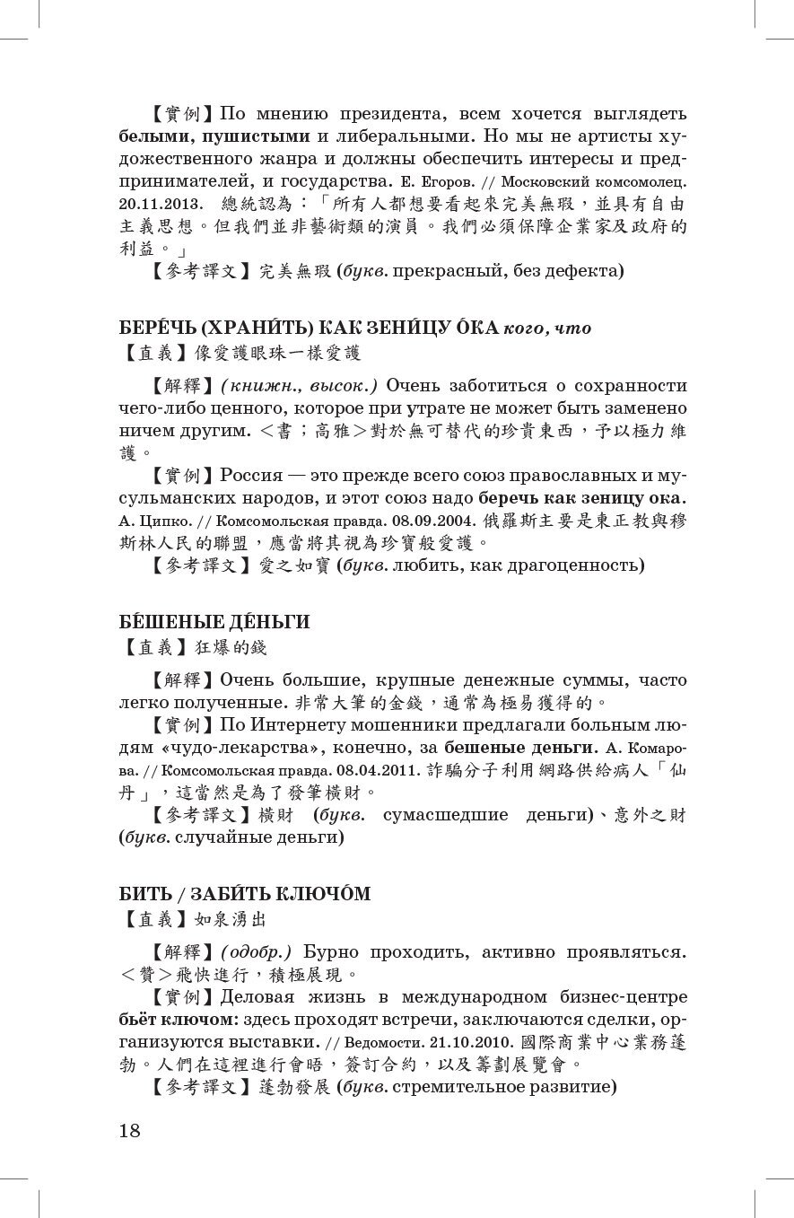 Словарь является справочным пособием учебного типа по русской фразеологии. Он содержит более 500 фразеологических оборотов русского языка, широко употребляемых в российских СМИ ХХI века. Фразеологические обороты переведены на китайский язык и использованием традиционного китайского письма. Словарь адресован китайскоязычным студентам, изучающим русский язык, преподавателям русского языка, переводчикам, журналистам и всем, кто развивает сотрудничество с Россией.