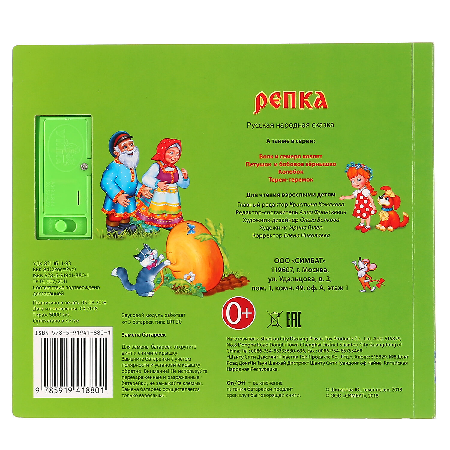 Ребёнок с удовольствием будет листать плотные страницы, рассматривать яркие картинки, нажимать на кнопки и слушать озвученные реплики героев сказки и песенку про репку. Малыш легко освоит включение звука: по нажатию на кнопку звук включится, при втором нажатии выключится. Благодаря компактному формату книгу удобно взять с собой в дорогу.