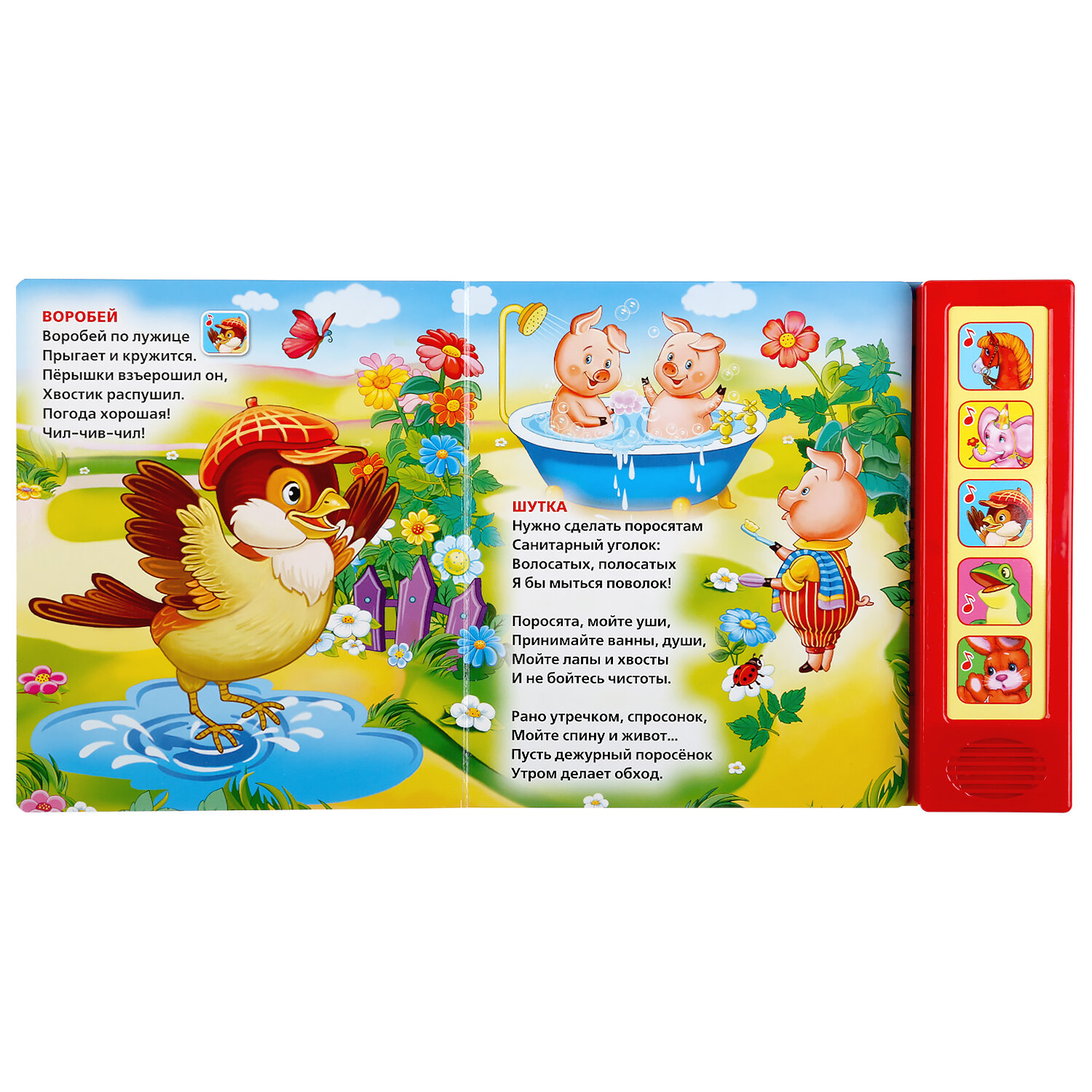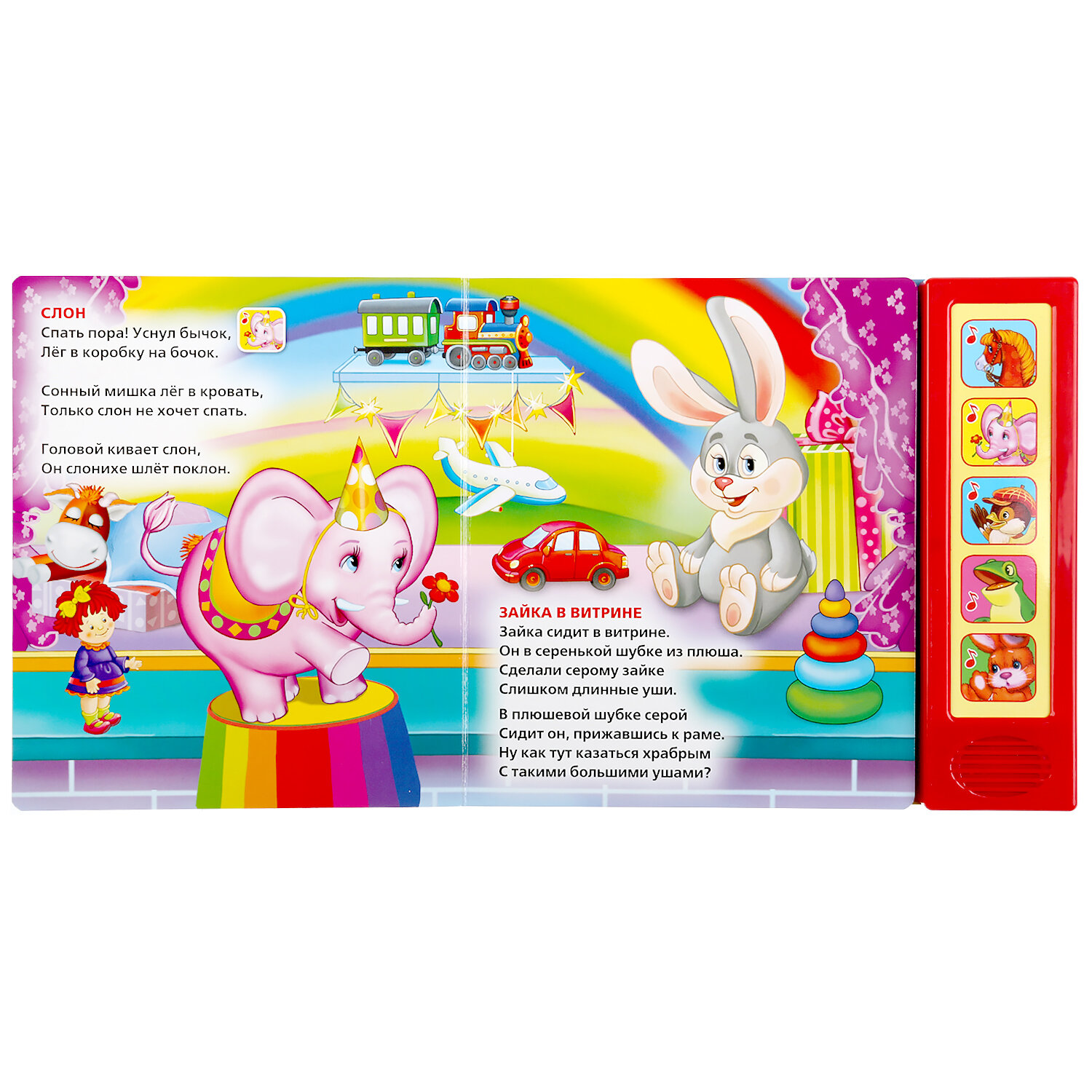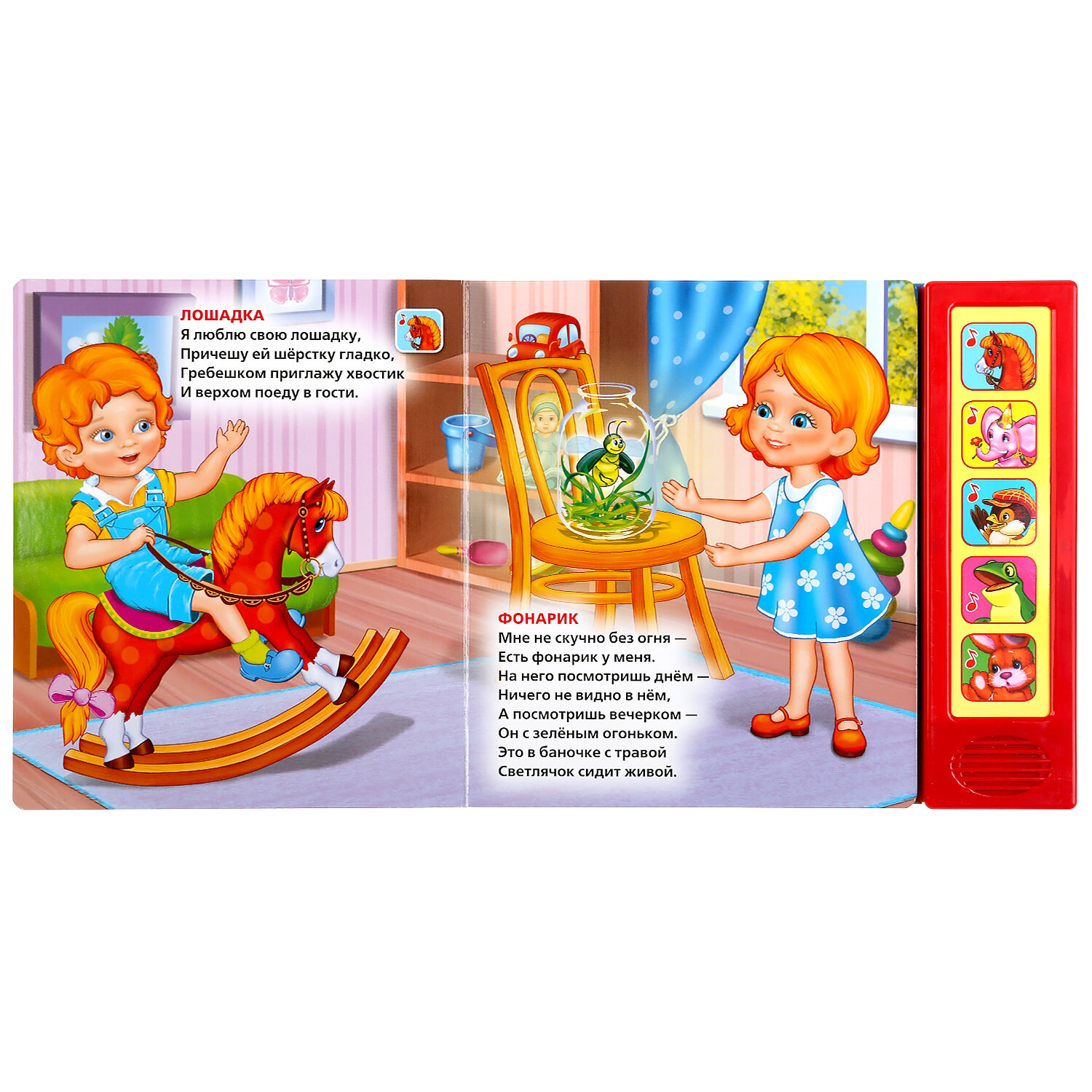 В этой книге собраны 10 замечательных стихотворений Агнии Барто: "Лошадка", "Слон", "Зайка в витрине", "Воробей" и другие. Теперь можно не только познакомиться с веселыми стихами, но и послушать песенки. Читайте книжку вслух, а малыш пусть сам нажимает музыкальные кнопочки, чтобы послушать песенки. Яркие цвета, красивые картинки и удобные страницы обязательно понравятся малышу. Формат книги идеально подходит для маленьких детских рук, страницы из плотного картона не так просто помять или порвать. Книга развивает у ребенка интерес к чтению, слуховое и зрительное восприятие, мелкую моторику.