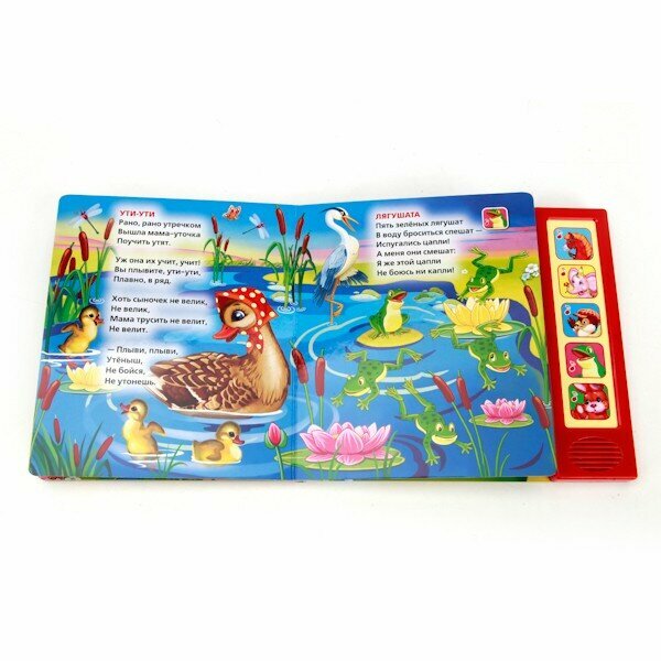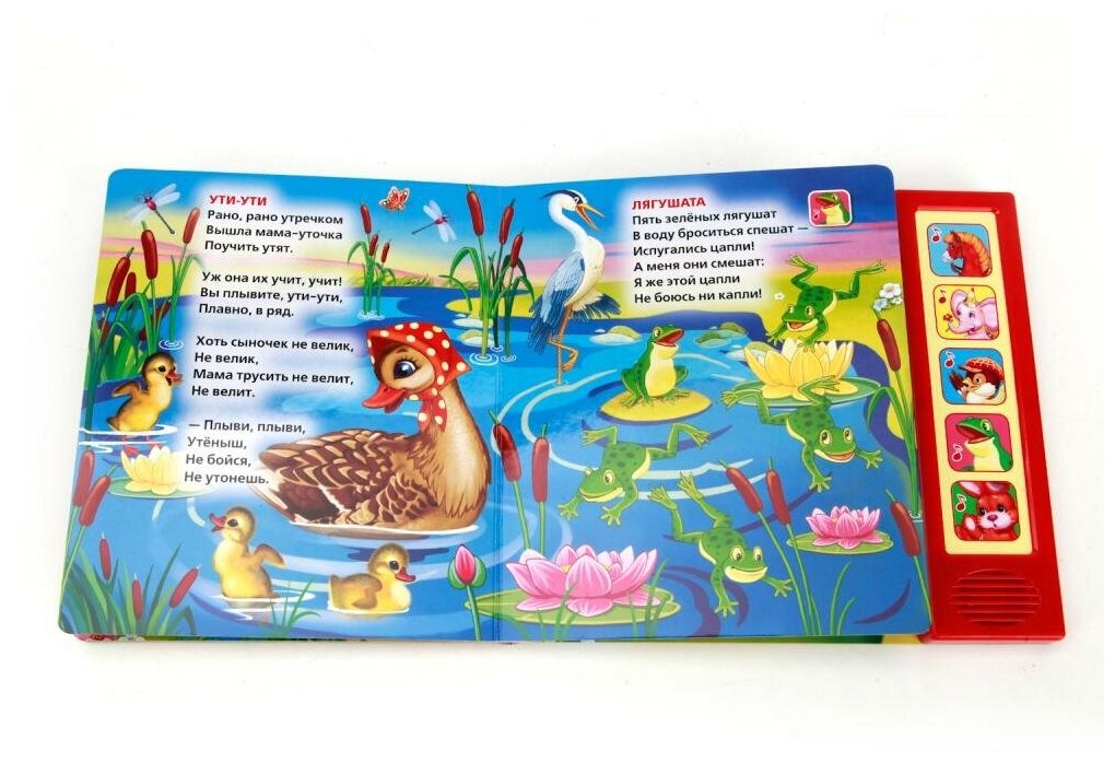 Замечательная, добротная книга с яркими иллюстрациями. Годовалый ребенок с интересом рассматривает ее и нажимает на кнопки, чтобы послушать песенки: "Лошадка", "Слон", "Воробей", "Лягушата" и "Зайка". Их исполняет женский, звонкий голос с правильным интонированием. В книге еще пять стихотворений: "Фонарик", "Зайка в витрине", "Шутка", "Ути-ути" и "Мой пес". Рекомендую. Буду покупать книжки из этой серии.