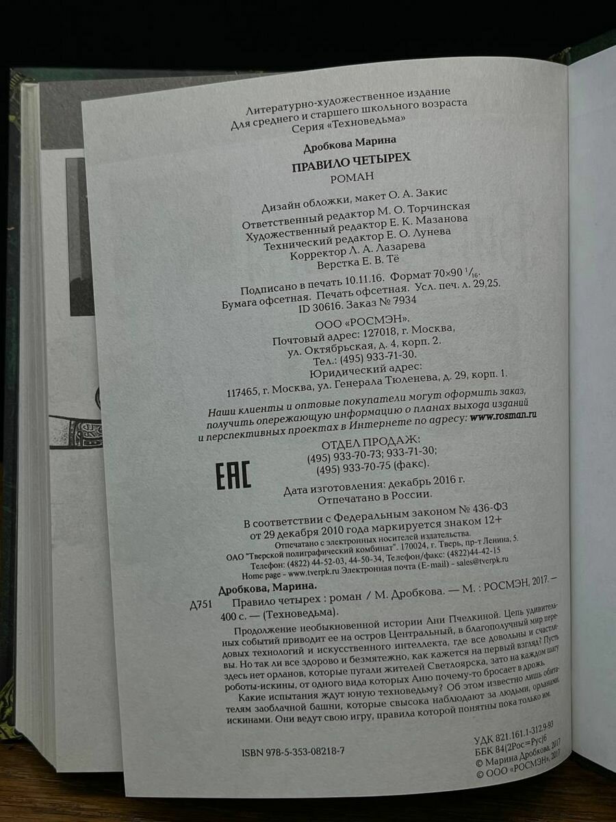 "Правило четырех" - вторая книга Марины Дробковой из серии "Техноведьма". Продолжение необыкновенной истории Ани Пчелкиной. Цепь удивительных событий приводит ее на остров Центральный, в благополучный мир передовых технологий и искусственного интеллекта, где все довольны и счастливы. Но так ли все здорово и безмятежно, как кажется на первый взгляд? Пусть здесь нет орланов, которые пугали жителей Светлоярска, зато на каждом шагу роботы-искины, от одного вида которых Аню почему-то бросает в дрожь. Какие испытания ждут юную техноведьму? Об этом известно лишь обитателям заоблачной башни, которые свысока наблюдают за людьми, орланами, искинами. Они ведут свою игру, правила которой понятны пока только им.