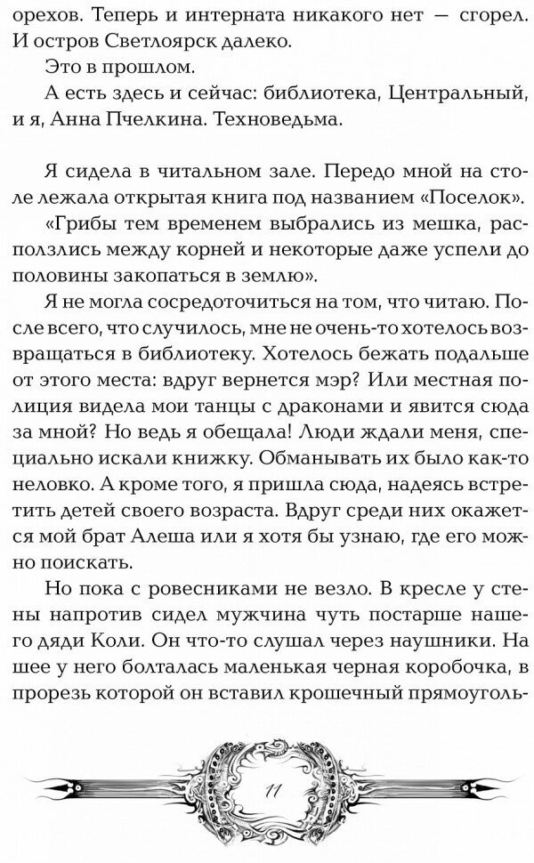 Возможны спойлеры! Мир Техноведьмы продолжает развиваться. На островах начинают просыпаться в людях древние существа. Грифоны, драконы, фениксы и загадочная мастер дверей. А Пчелкина Аня путешествует по Центральному острову в поисках брата. Она заводит новых друзей: Арта, Елку и других. На острове девочка встретила искинов, тех же орланов и зомбированных людей с мыслешунтами. Также не забыт и Светлоярск. Ребята противостоят власти и попутно узнавая много нового о себе. Очень порадовала битва, показанная с интересных ракурсов. А загадочное Правило Четырех определяет настрой книги и обещает в будущей книги полноценную битву.