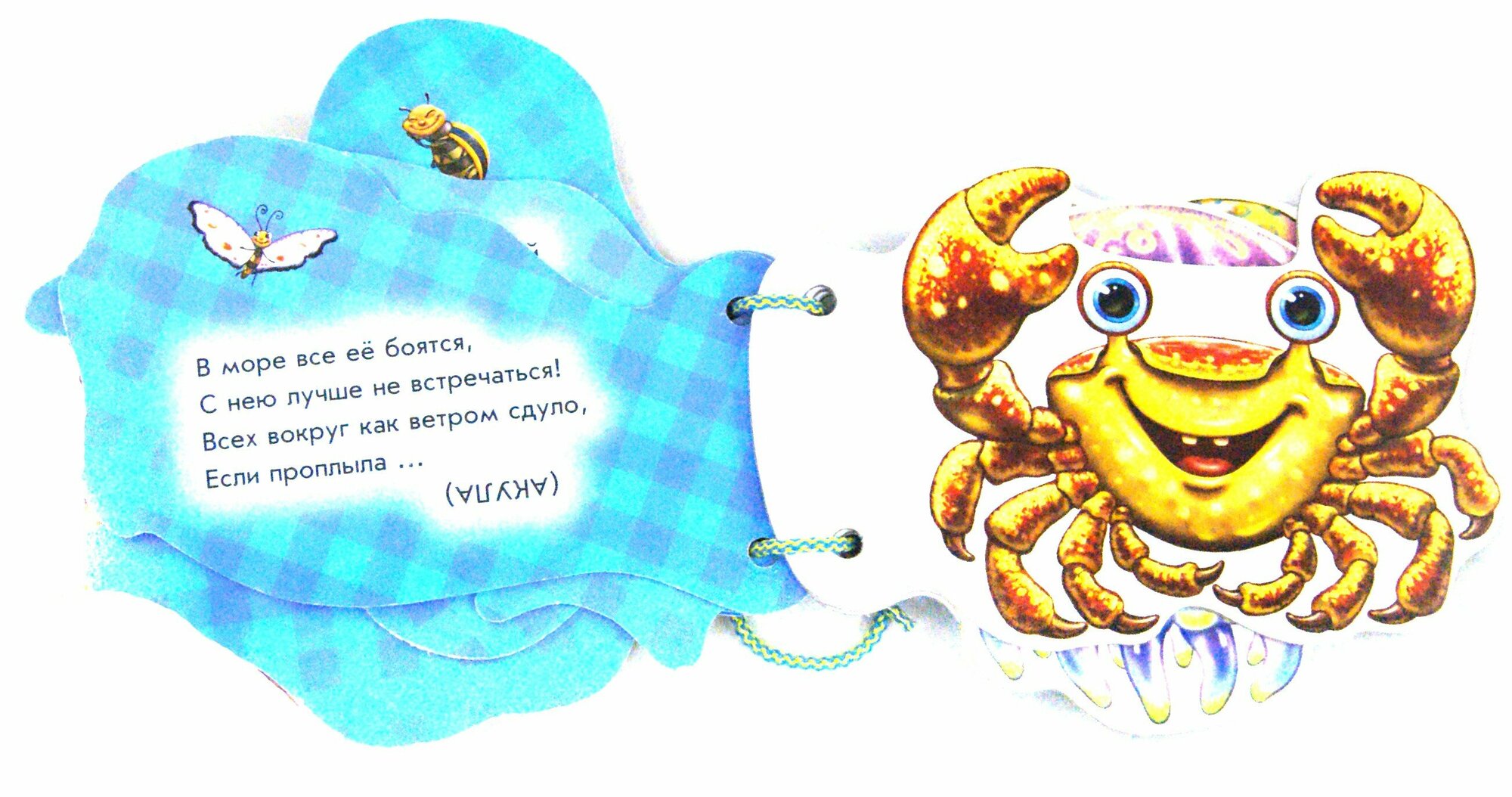 Маленькая книжица, выполненная из крепкого картона, позволит малышу познакомиться с обитателями моря. Картинки красивые, яркие, но не совсем реалистичные, больше похожи на мультяшных персонажей. Представлены 7 обитателей моря: рыбка, морской конек, дельфин, акула, краб, медуза и осьминог.
