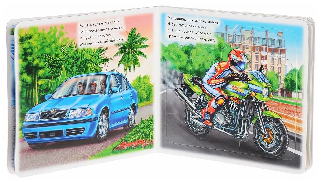 Для мамы мальчиков, которые фанатеют машинами, эта серия "Ребятам о машинах" - настоящая находка. У нас 2 книги из серии в маленьком формате, а другие 2 - в виде пазлов, о каждой отдельно напишу. Сын научился собирать пазлы из большого количества деталей в 1.7-1.8 года, и мы ему приобрели 2 новых книги с машинами от Ранок. В книге 5 разворотов, слева - рисунок и стихотворение, справа стихотворение и пазл. Страницы из картона, насчет плотности я бы сказала "выше среднего", погнуть их сложно, но если очень постараться - можно. Сын у нас аккуратный, так что проблем с этим нет. Под пазлами скрывается эта же картинка, но в нарисованном виде. То есть ребенок может собирать рисунок как отдельно за столиком, так и непосредственно в книге, сопоставляя детали по рисунку. Картон глянцевый, а "нарисованная подложка" под пазлом - матовая. Мне лично не очень нравится обилие элементов на заднем плане и оформление обложки, люблю более лаконичные картинки, но это мелочи.
