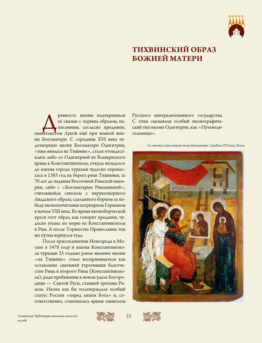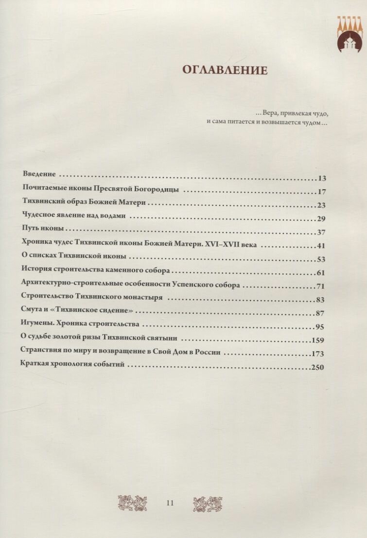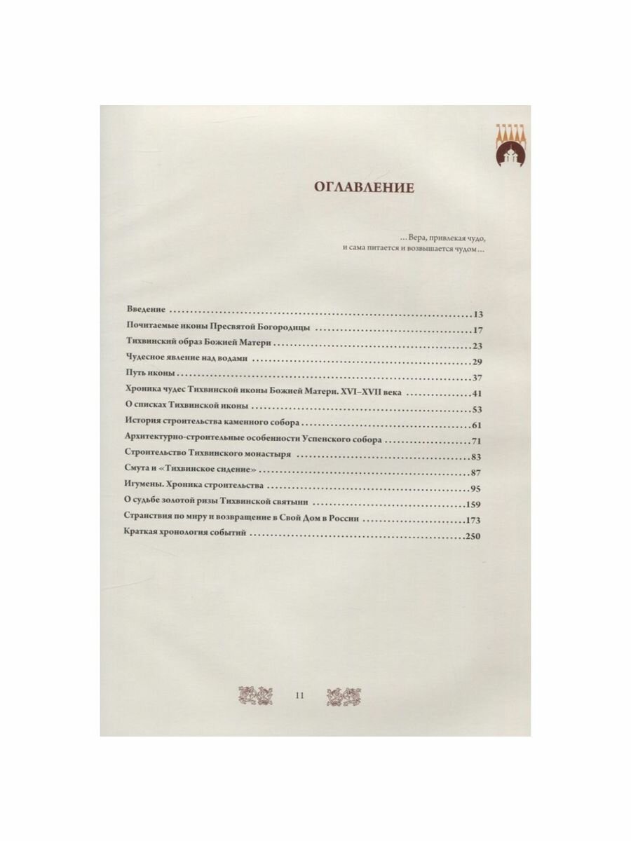 Явление иконы Божией Матери над водами Ладоги и её чудесный путь на реку Тихвинку в 1383 году стали значительными событиями для всей Русской земли. Её происхождение приписывается святому евангелисту Луке, и это один из немногих образов Божией Матери, история которого исходит из начального христианства. Построенный для неё каменный храм, возведённый по повелению Великого князя Московского и Всея Руси Василия III итальянским зодчим Фрязиным с новгородским строителем Сырковым, стал для Богородицы Домом. Он стал притягателен для Государева паломничества. Множество народа приходило поклониться Богородице в Её Дом. Тихвин превратился в значительный центр отечественной духовной культуры. Чудотворно-явленная икона, названная Тихвинской, стала признанной защитницей северных рубежей нашей страны. Окружённый впоследствии монастырскими стенами по повелению Иоанна Грозного, построенный для Неё белоснежный храм выдержал множество испытаний, выпавших на долю Руси. Он стал частью её истории и выдающимся наследием культуры нашей страны. Множество списков с Тихвинской иконы распространились по городам и весям, став признанными местными святынями. Списки Тихвинского образа участвовали во всех выдающихся сражениях и свершениях государства Российского и сегодня не найти в оном ни одного храма, где бы не было Тихвинского образа Богородицы. В безбожное время Тихвинский монастырь был закрыт, а святая икона отправилась в странствие по миру. Восстановление монастыря произошло в 1995 году, а в 2004 в свой Дом вернулась Святыня - Тихвинская Чудотворно-явленная икона Божией Матери. В 2015 году исполняется 500 лет со времени освящения главного, Успенского собора Тихвинского монастыря и 20 лет со дня возрождения Тихвинского Богородичного Успенского монастыря. В предлагаемом вниманию читателя богато иллюстрированном издании рассказывается о чудесном явлении на Тихвинке, истории иконы и её странствиях, строительстве её Дома, истории и возрождении монастыря.