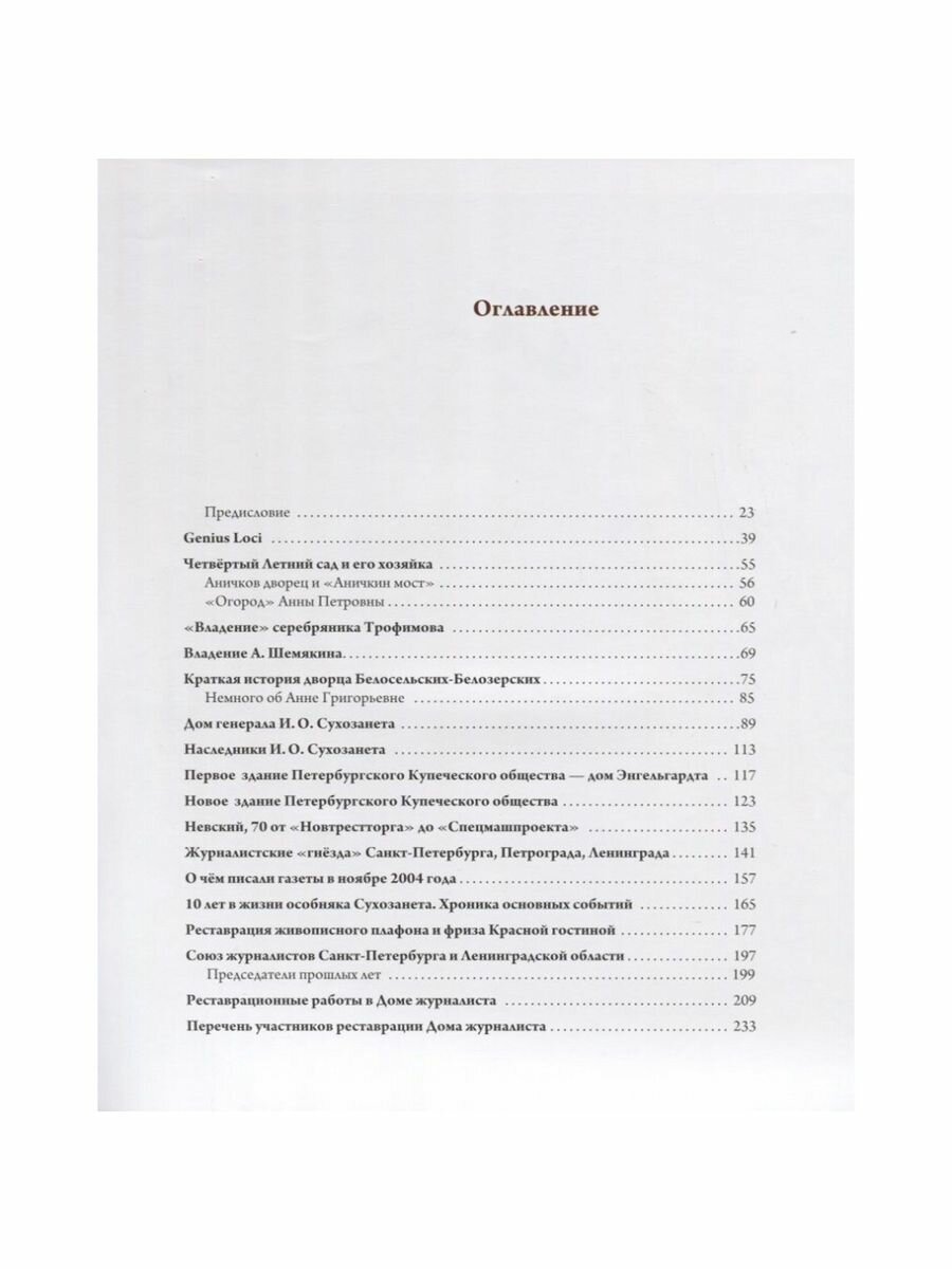 Эта книга даёт возможность пройти читателю по Северной Столице во времени и пространстве. Увидеть, как рождался и формировался Петербург на протяжении трёх столетий, на примере зданий на пересечении Невского и Фонтанки. Конечная цель путешествия — дом генерала И.О. Сухозанета на Невском проспекте, 70, который принадлежит Союзу журналистов. Книга подводит к нему через историю не только застройки всего квартала исторического центра города, но и личностей, заказывающих и строящих дома на Невском проспекте. Изначально это была территория двух Летних садов, принадлежащих царевнам Елизавете и Анне Петровне, своеобразное продолжение Летнего сада их отца, императора Петра, некогда простиравшееся далеко за Невскую першпективу. Здания, расположенные на левом и правом берегу Фонтанки, связывают время в единую нить. Имея каждый свою историю, дают возможность увидеть происходящие изменения у Аничкова моста век за веком, смену владельцев, почерк знаменитых архитекторов. Значительное внимание оказано в книге истории реставрации и приспособления дома 70 на Невском проспекте. Именно вокруг него создаётся определённое культурное поле, позволяющее увидеть рядовую историческую застройку, как неотъемлемую часть Санкт-Петербурга, подчёркивающую величие знаменитых архитектурных ансамблей.