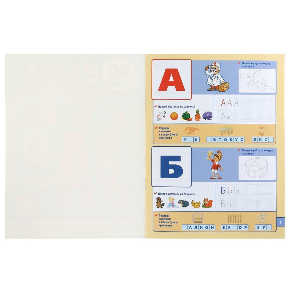 Умка Книга с многоразовыми наклейками Школа Жуковой Первая азбука представляет собой сборник увлекательных упражнений, которые помогут ребенку в доступной игровой форме изучить буквы и научиться читать. Красочные иллюстрации обязательно понравятся малышу, а набор цветных наклеек сделает процесс обучения еще занимательней.