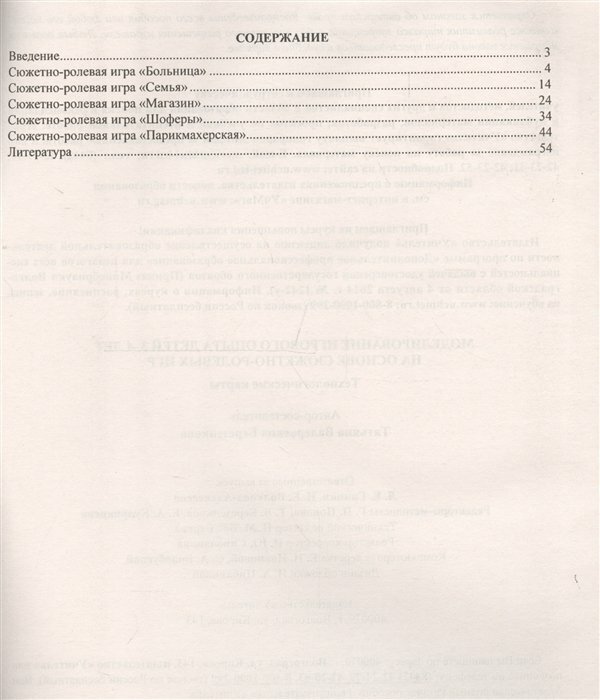 Книга для воспитателей детских садов. Книга большого формата А4, в мягком переплёте. В книге описывается 5 сюжетно-ролевых игр для возраста от 3-4 лет (Больница, семья, шофёры, магазин, парикмахерская). В начале каждой игры расписываются цели, этапы, принципы и средства реализации данной игры. Сама игра расписана на весь год, по месяцам. На месяц ставится конкретная задача и автор делит таблицу на две части: первая это обогащение жизненного опыта детей, сюда входит: