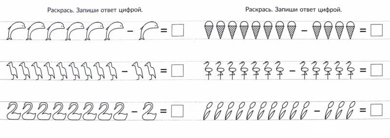 .Обратите внимание ребёнка на то, что если при сложении результат требует подсчёта всего количества предметов, то при вычитании достаточно мысленно наложить меньшее количество на большее и подсчитать только остаток. В этих целях мы предлагаем в примерах на вычитание выполнять штриховку от предмета к предмету - справа налево.