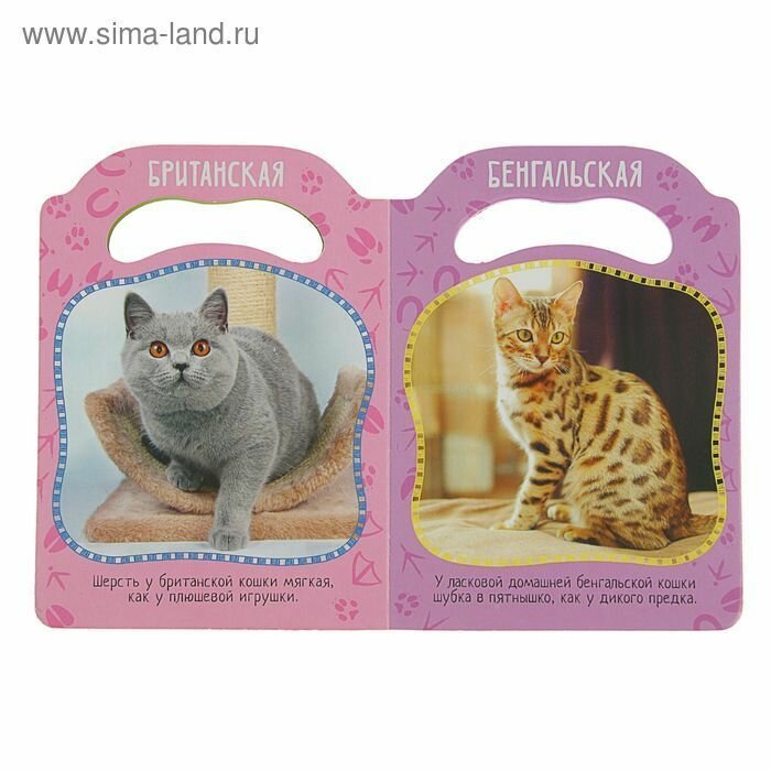 В картонной книжке со сквозной вырубкой-ручкой – большие яркие фотографии с подписями. Книжка познакомит малыша с кошками - одними из самых древних домашних животных