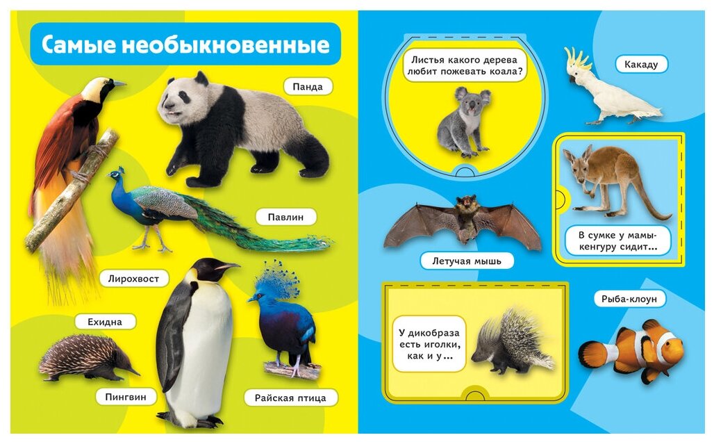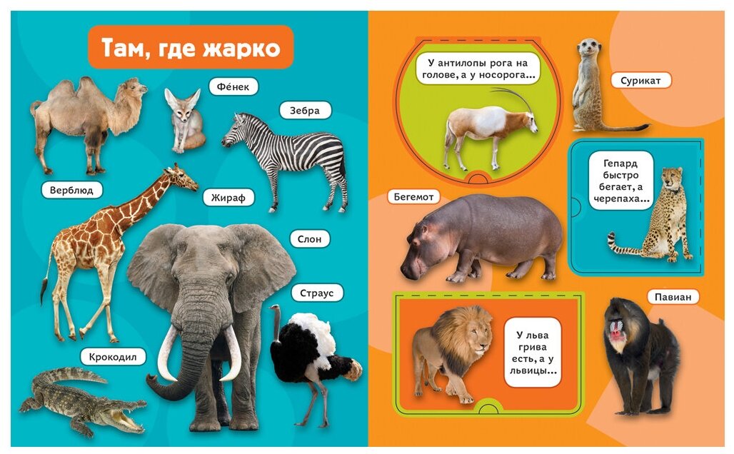 Книга формата примерно а5. Обложка и листы выполнены из плотного картона, который при желании можно сломать. В книге четыре разворота, на каждом из них по три окошка с короткими вопросами; под окошками расположены ответы в виде картинок. Иллюстрации сделаны в виде фотоколлажей, представлены преимущественно экзотические животные.