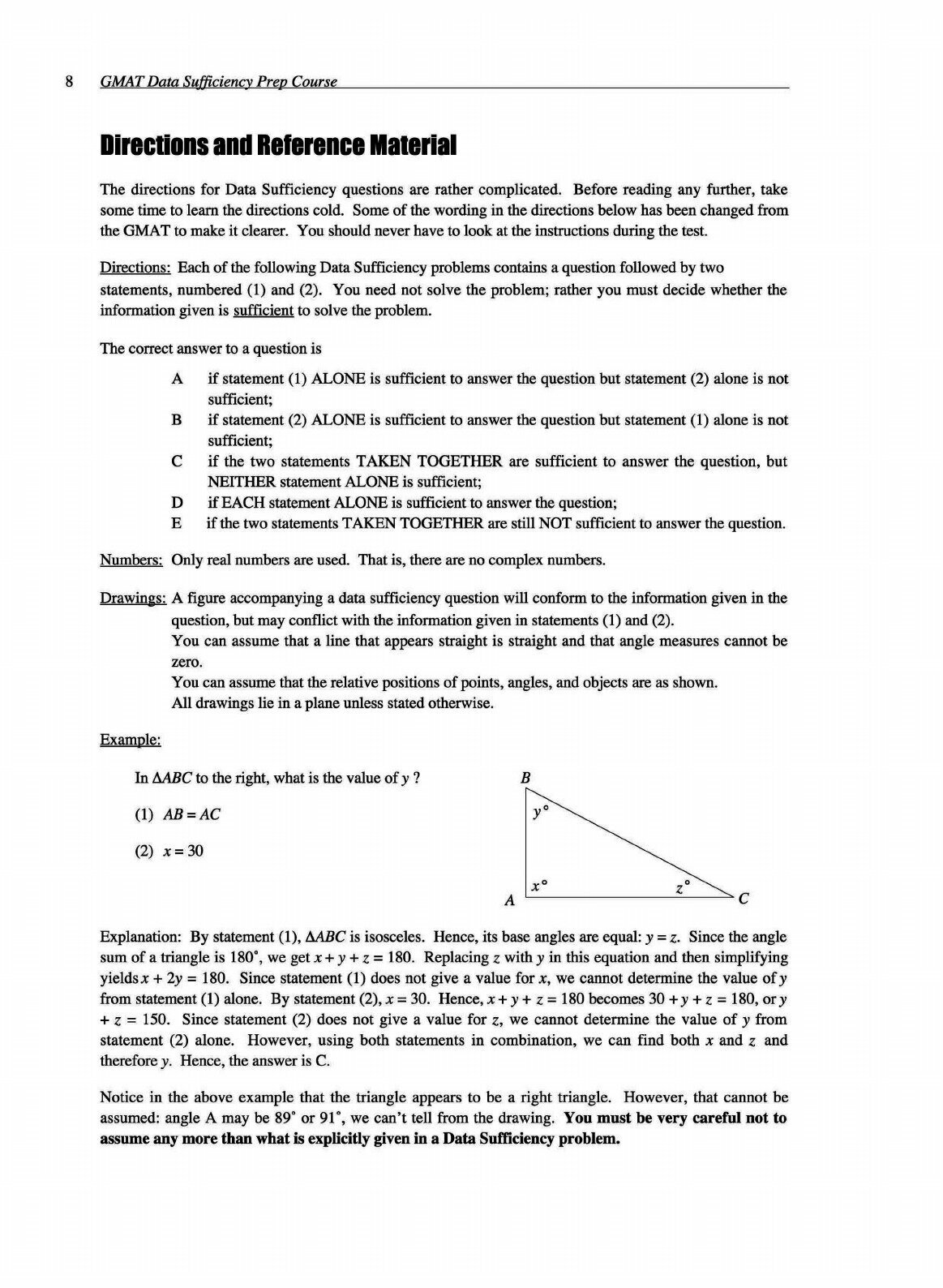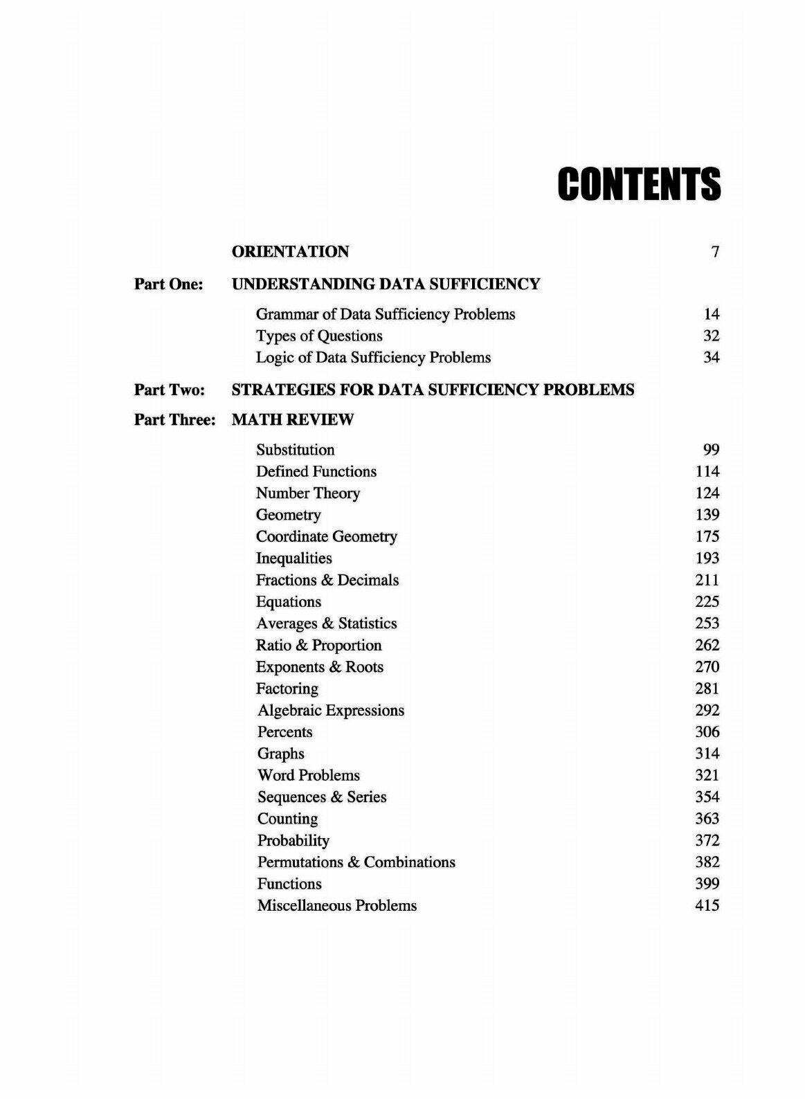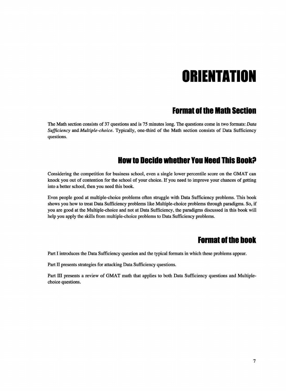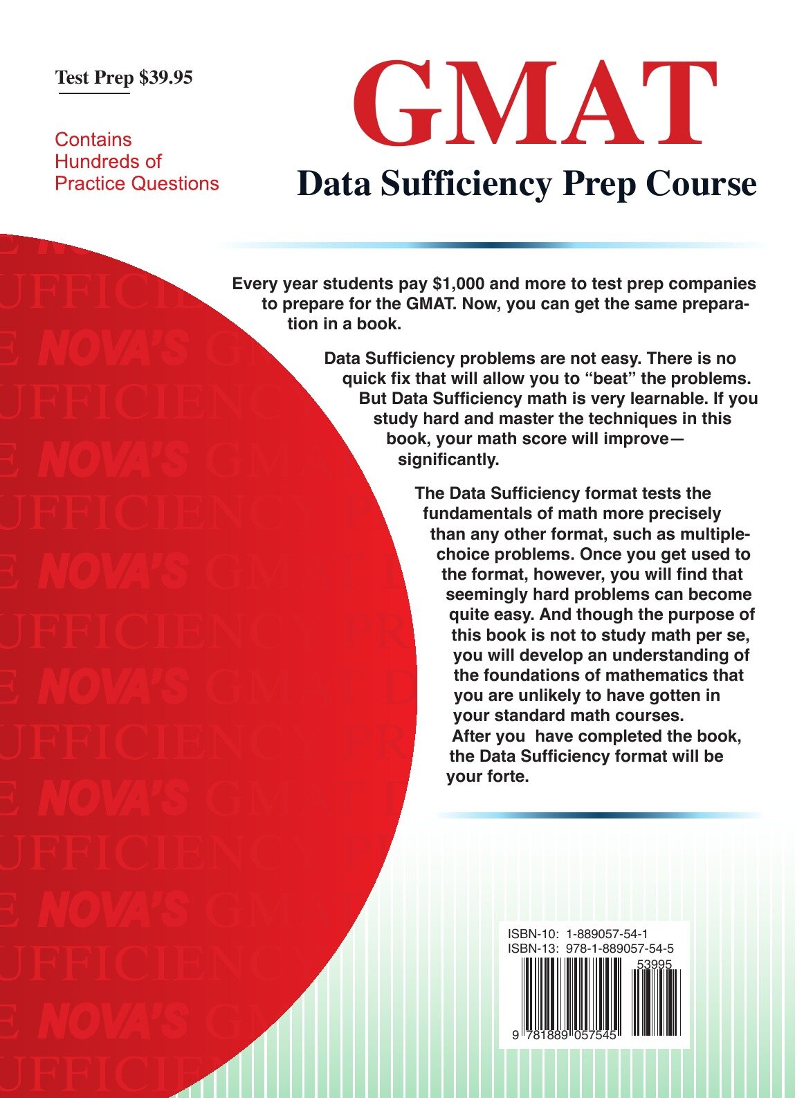 Comprehensive Prep for GMAT Data Sufficiency. Every year, students pay $1,000 and more to test prep companies to prepare for the math section of the GMAT. Now you can get the same preparation in a book.Although data sufficiency problems are difficult, they are very learnable. GMAT Data Sufficiency Prep Course presents a thorough analysis of GMAT math and introduces numerous analytic techniques that will help you immensely, not only on the GMAT but in business school as well.Features:Comprehensive Review: Twenty-four chapters provide the most thorough review of data sufficiency math available.Practice: Includes 196 examples and more than 205 exercises!Performance: If your target is a 700+ score, this is the book!