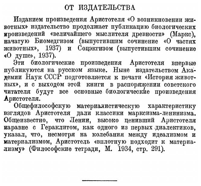 Изданием произведения Аристотеля "О возникновении животных" издательство продолжает публикацию биологических произведений "величайшего мыслителя древности" (Маркс), начатую Биомедгизом (выпустившим сочинение "О частях животных", 1937) и Соцэкгизом (выпустившим сочинение "О душе", 1937). Эти биологические произведения Аристотеля впервые публикуются на русском языке. Ныне издательством Академии Наук СССР " подготовляется к печати "История животных", и с выходом этой книги в распоряжении советского читателя будут все основные биологические произведения Аристотеля. Общефилософскую материалистическую характеристику взглядов Аристотеля дали классики марксизма-ленинизма. Общеизвестно, что Ленин, высоко ценивший Аристотеля наравне с Гераклитом, как одного из первых диалектиков, указал, что, несмотря на колебания между идеализмом и материализмом. Аристотель "вплотную подходит к материализму"
