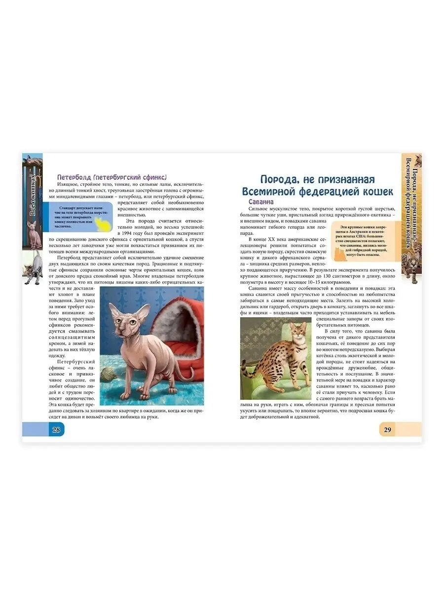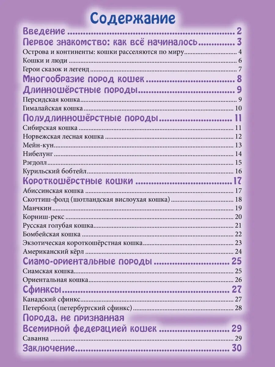 Первые несколько страниц рассказывают общую информацию о кошках, остальные страницы посвящены кошачьим породам. Данная книга поможет вам выбрать породу своего будущего питомца, или будет отличным подарком ребенку или любому(-ой) кошатнику(-це) :)