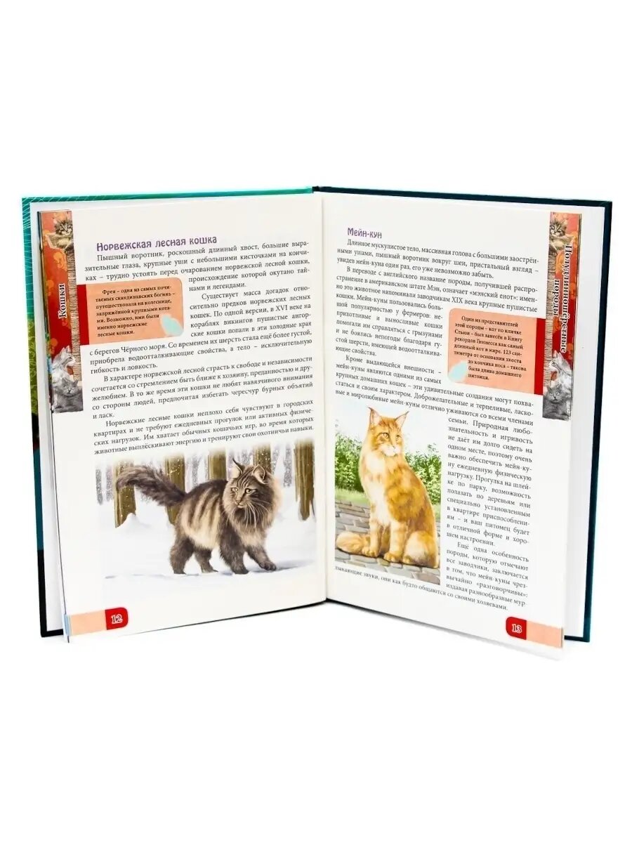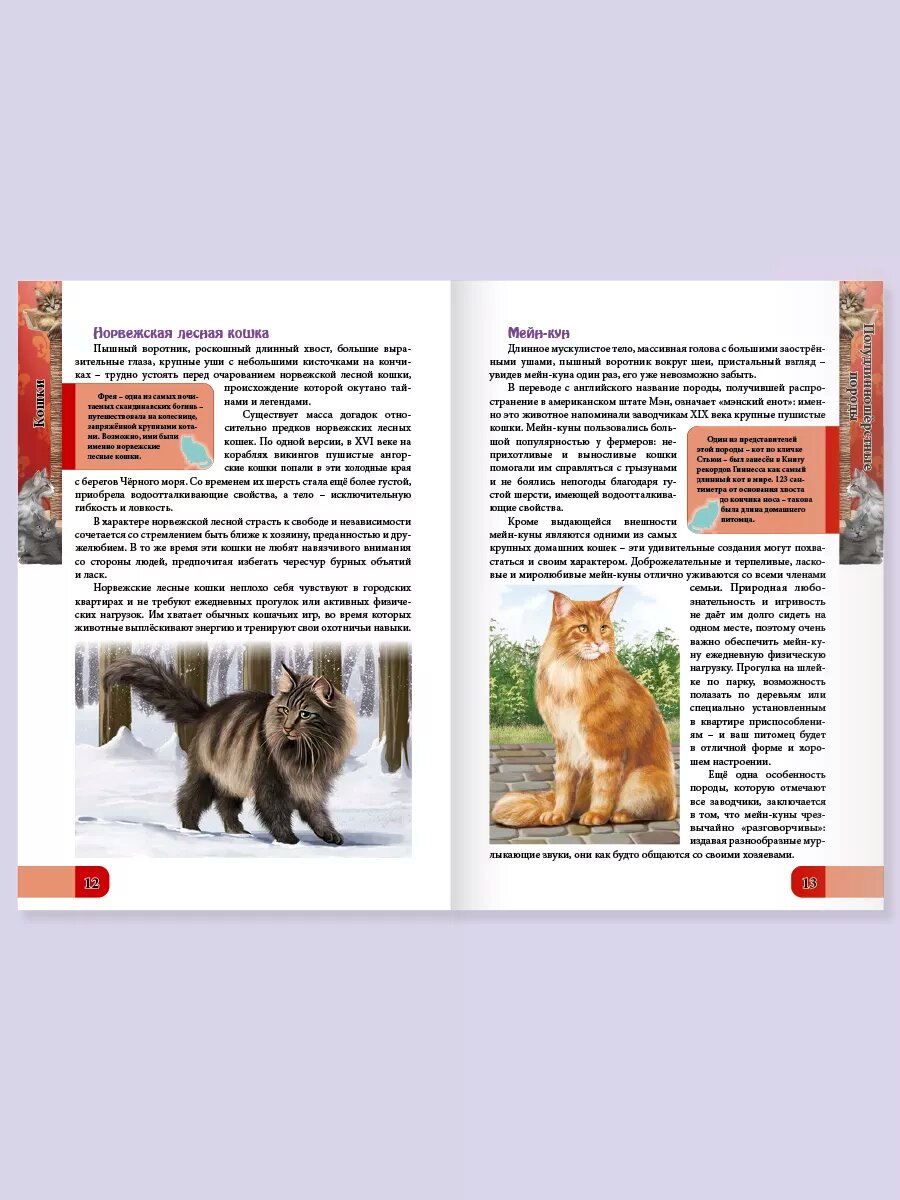 Самое приятное в книге—это плотная блестящая целлофанированная обложка. Странички слегка шершавые, качество иллюстраций не очень, весьма размытые встречаются. Маленький объем книги —всего 32 странички. Соответственно мало информации , в основном о самых известных породах. Взяла для дочки 7 лет, она любит кошек и для самостоятельного чтения подходит вполне