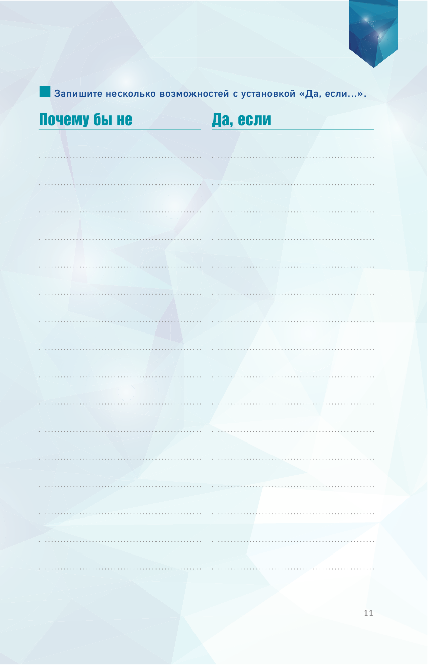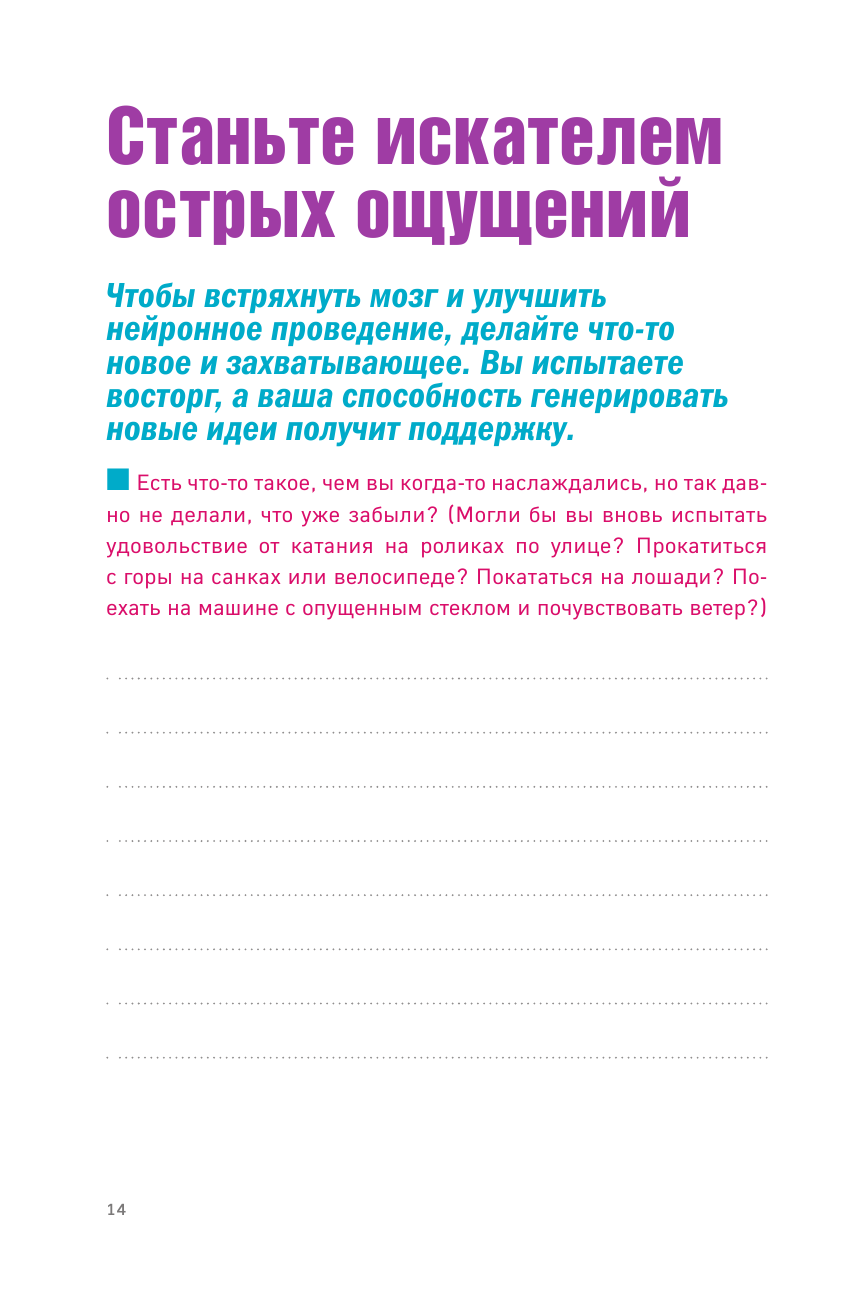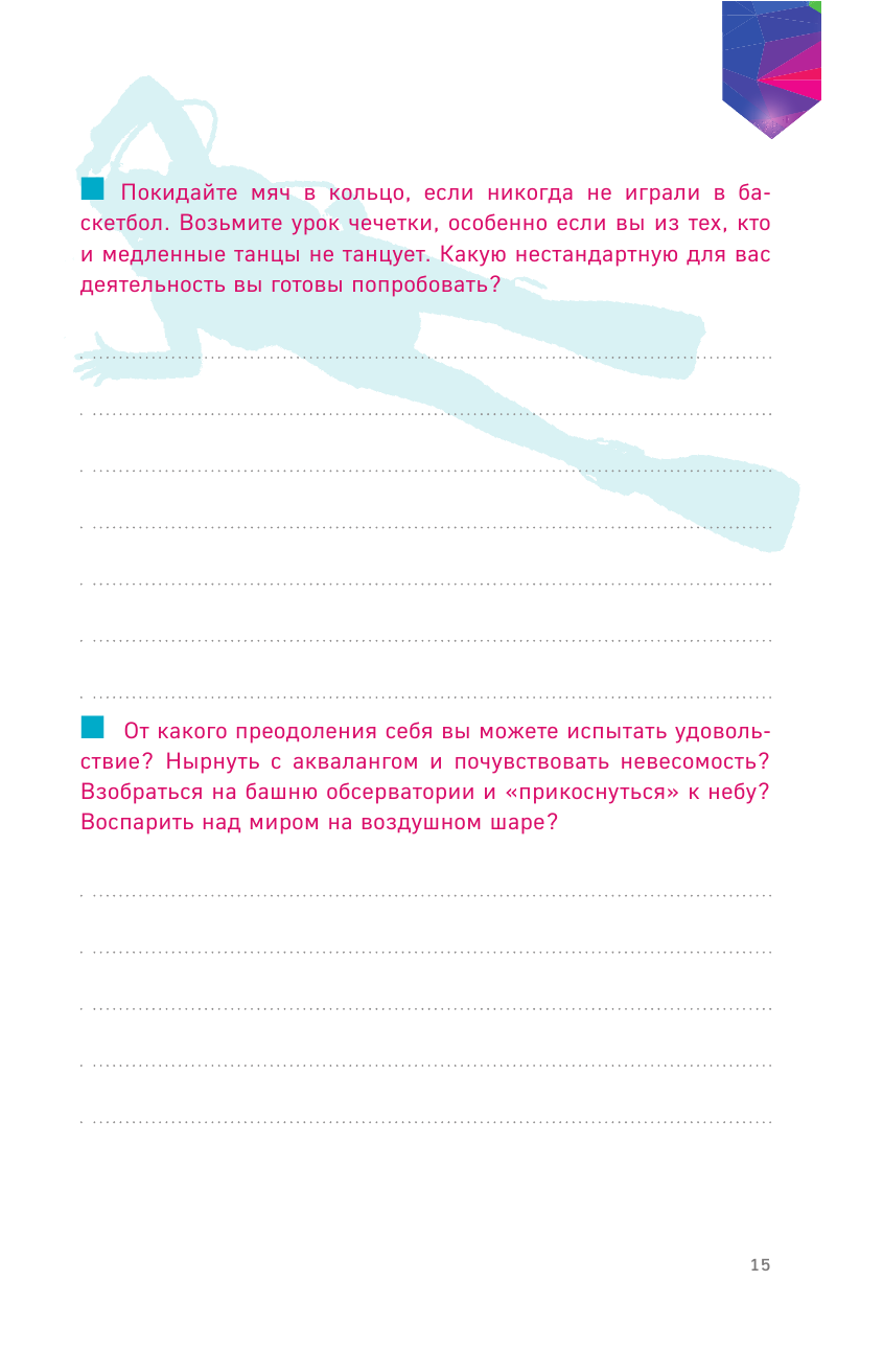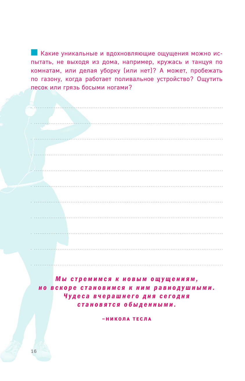 поначалу раздражает важность прописывать на каждом листе прописные истины. И так понятно что ты "человек, мужчина...". Но потом втягиваешься, принимаешь как игру, иначе зачем купил эту книгу. Понимая, что и это идет на пользу - записываешь, а потом посмеиваешься. А через день - удивляешься тому, как в сущности, таким образом, нарыл у себя внутри интересные для жизни "начала", которые многие называют позитивом. Я креативный по образованию и мне нужна была такая "прокачка" мозга. Многое замыливается, стирается в памяти... Книга дает возможность незаметно для других становиться безбашенным и открытым для летающих возле муз. Прикольно, что люди наконец приняли факт того, что этому миру пора заботиться о творческих потенциалах человеку. Слишком много серости добралось до управления планетарным сознанием. Поддерживаю авторов подобных книг. Нужно жить позитивно, а это возможно только с теми, кто мыслит креативно!