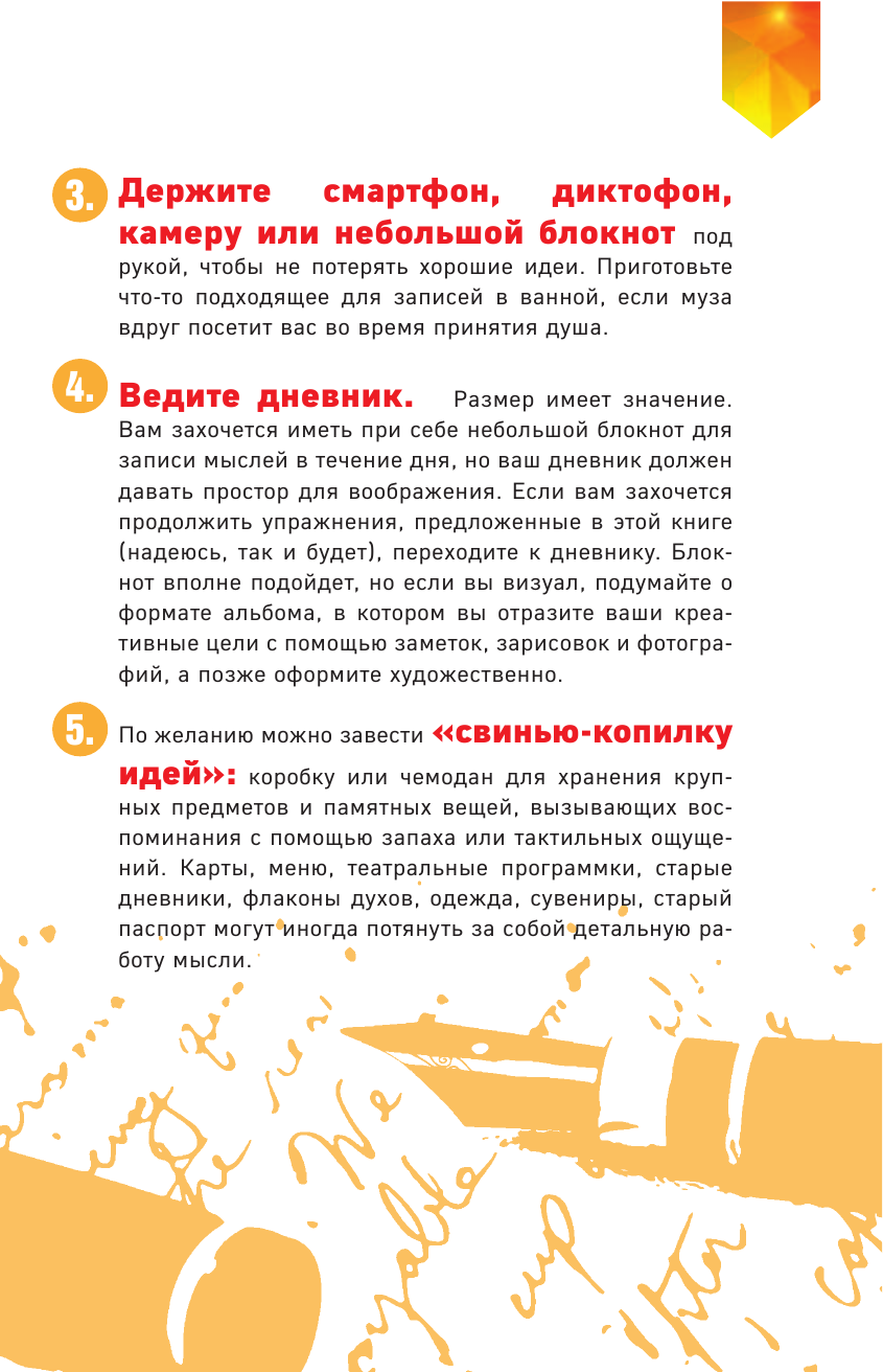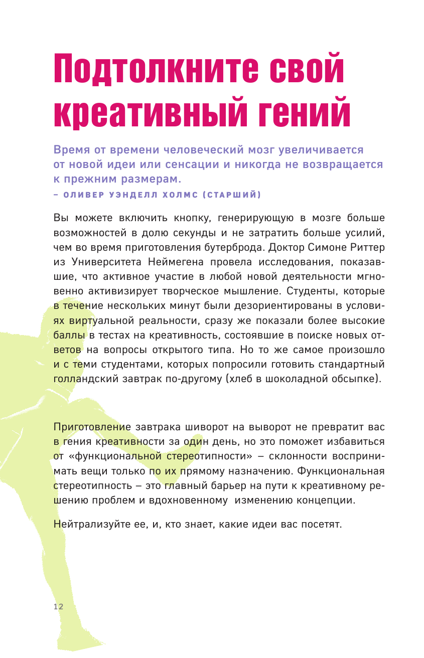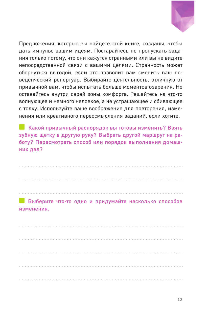 Я отношусь настороженно к подобного рода книгам... Однако эта книга произвела на меня приятное впечатление. Понравилось, что данная книга это своего рода учебник-практикум. Здесь нет длинных, пространных рассуждений о том, как стать более креативным и творческим человеком. Здесь есть интересные, необычные задания, которые лично я выполнила с большим удовольствием