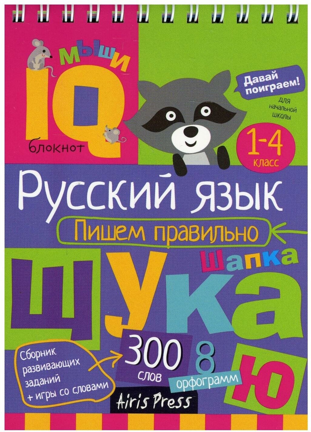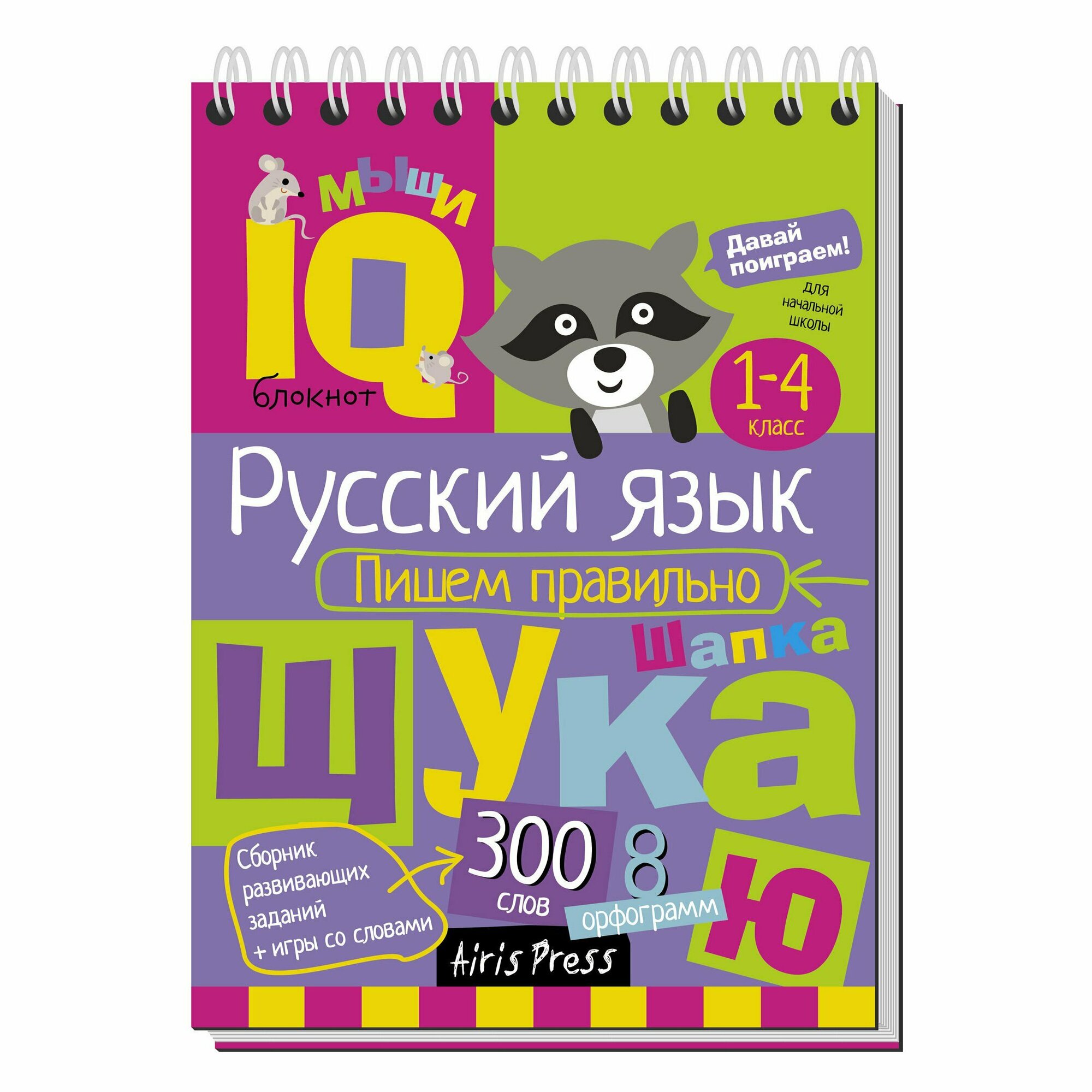 блокнот на 300 слов, таких как вершина, шило, и других слов в сочетании слогов: жи-ши ча-ща, чу-щу. Такие задания приведены, как среди квадрата букв найти профессии и обвести в словах безударные гласные; разгадать ребусы; обвести парные согласные; также написание слов с пропущенной буквой и ответ справа верный для проверки, только данный лист требует разрезания. Также задания, как в путанице слов найти слова которые нельзя перенести.