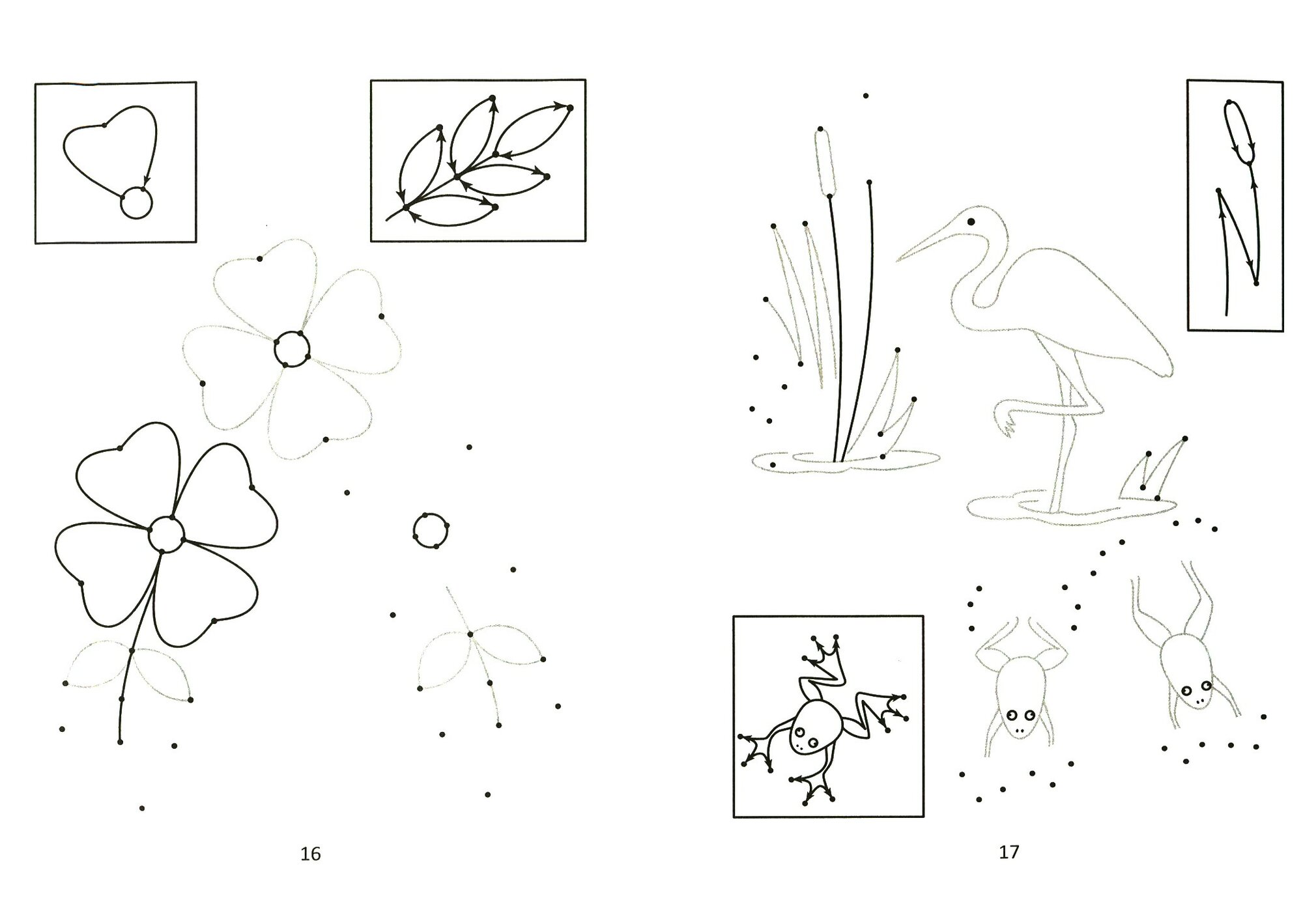 В книге ребёнку предлагается восполнить рисунок, проведя линии через опорные точки. При этом характер прохождения через них меняется от задания к заданию. Это способствует развитию зрительного внимания и графомоторных навыков, которые пригодятся ребёнку при овладении письмом.