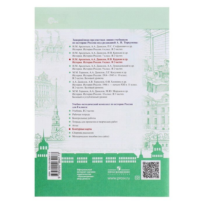 Линия УМК «Под редакцией А.В. Торкунова (6-10 классы)» Контурные карты являются составной частью учебно-методического комплекта «История России. 8 класс» (авторы учебника Н.М. Арсентьев, А.А. Данилов, И.В. Курукин, А.Я. Токарева) и представляют собой современное учебное картографическое издание. Цветные контурные карты выполнены в технике объёмного изображения рельефа. К каждой карте предлагается система заданий разных типов и уровней сложности, ориентированных как на закрепление основных исторических знаний и формирование базовых навыков, так и на развитие аналитических способностей школьников. Контурные карты могут быть использованы с любым из действующих учебников по истории для 8 класса.