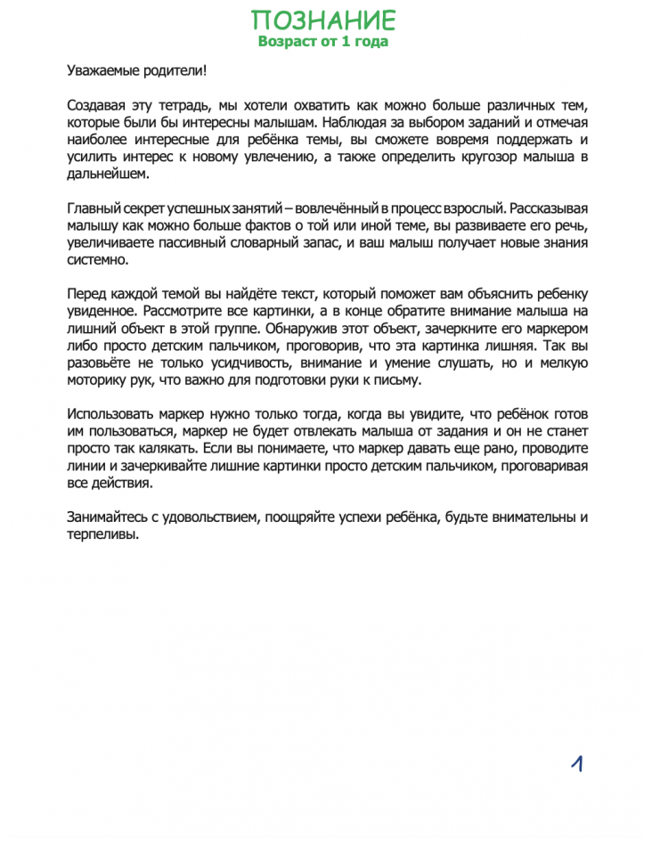 Создавая эту тетрадь, мы хотели охватить как можно больше различных тем, которые были бы интересны малышам. Наблюдая за выбором заданий и отмечая наиболее интересные для ребёнка темы, вы сможете вовремя поддержать и усилить интерес к новому увлечению, а так же определить кругозор малыша в дальнейшем. Главный секрет успешных занятий – вовлечённый в процесс взрослый. Рассказывая малышу как можно больше фактов по той или иной теме, вы развиваете его речь, увеличиваете пассивный словарный запас и ваш малыш получает новые знания системно. Перед каждой темой вы найдёте текст, который поможет вам объяснить ребенку увиденное. Рассмотрите все картинки, а в конце обратите внимание малыша на лишний объект в этой группе. Обнаружив этот объект, зачеркните его маркером либо просто детским пальчиком, проговорив, что эта картинка лишняя. Так вы разовьёте не только усидчивость, внимание и умение слушать, но и мелкую моторику рук, что важно для подготовки руки к письму. Использовать маркер нужно только тогда, когда вы увидите, что ребёнок готов им пользоваться, маркер не будет отвлекать малыша от задания и он не станет просто так калякать. Если вы понимаете, что маркер давать еще рано, проводите линии и зачеркивайте лишние картинки просто детским пальчиком, проговаривая все действия. Занимайтесь с удовольствием, поощряйте успехи ребёнка, будьте внимательны и терпеливы.