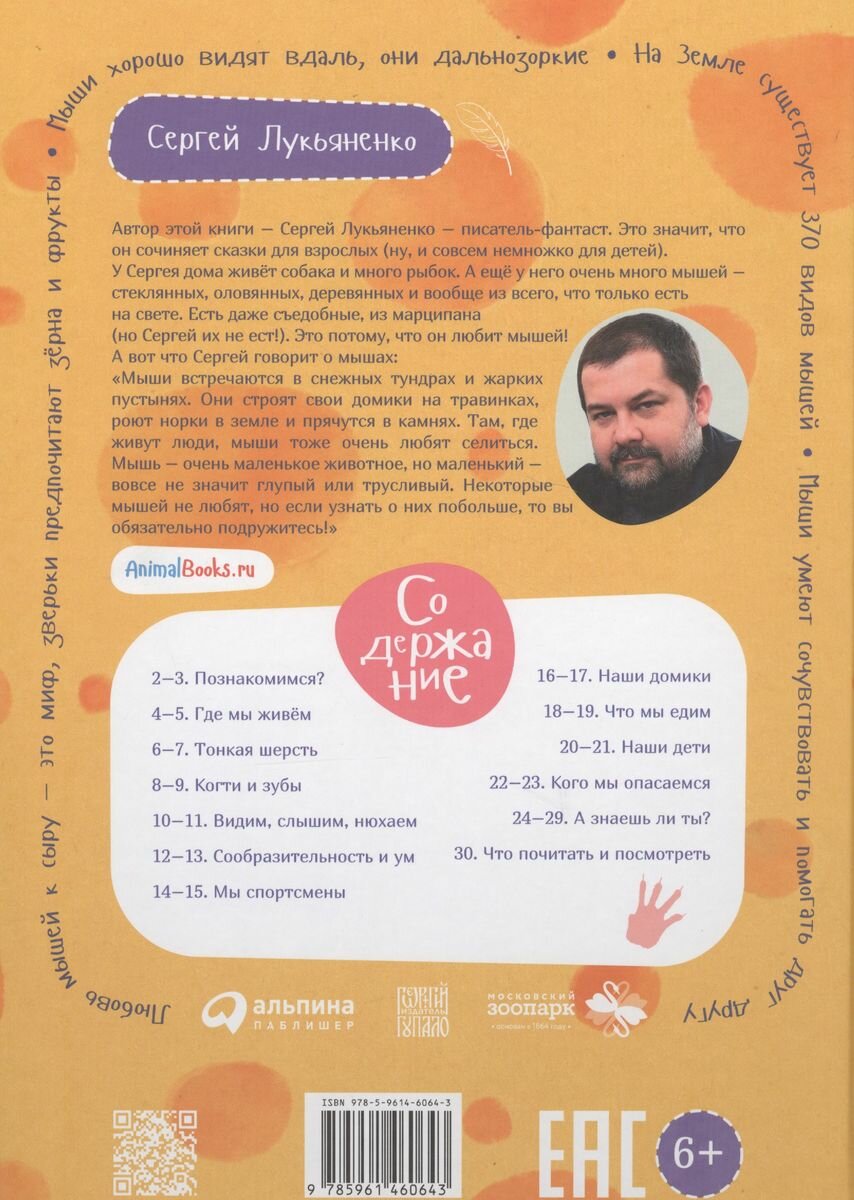 Любимая серия пополнилась чудесной книгой о мышах. Замечательные иллюстрации, мыши здесь везде, начиная с форзаца книги, где нарисованы портреты и бюсты предков мышки, которая рассказывает о себе и о своих сородичах. Иллюстрации очень добрые, нарисованы с юмором и большой симпатией к маленьким зверькам. В начале мы узнаем, какие бывают мыши, где они живут, какая у них шерстка, когти и зубы, как они видят, слышат и нюхают. Далее рассказывается, что они едят, в каких домиках живут, сколько у них бывает детей и кого они опасаются. То есть, прочитав эту книгу, можно узнать массу интересных фактов. А в конце книги даются советы, какие книги еще можно прочитать про мышей и какие посмотреть о них мультфильмы и фильмы. Замечательная книга!