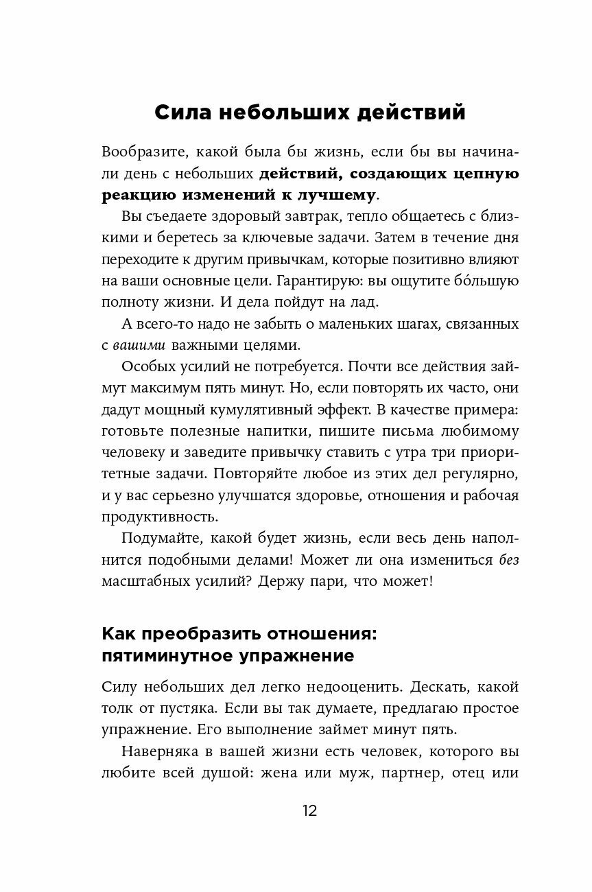 "10% конфликтов связаны с разницей во мнениях и 90% - с неверно взятым тоном". Полезная книга для тех, кто хочет изменить себя и свою жизнь, не прилагая сверхусилий. Автор описывает 127 минутных полезных привычек - несложных действий, создающих мощный совместный эффект в достижении целей. Привычки делятся на 7 блоков: карьера, финансы, здоровье, досуг, организация жизни, взаимоотношения и духовность. Выбирай любой и начинай менять свою жизнь к лучшему. Автор прилагает подробную инструкцию, как сформировать у себя ту или иную привычку и не расставаться с ней никогда. Не скажу, что эта книга сильно повлияла на мою жизнь, но все же внесла некоторые коррективы.