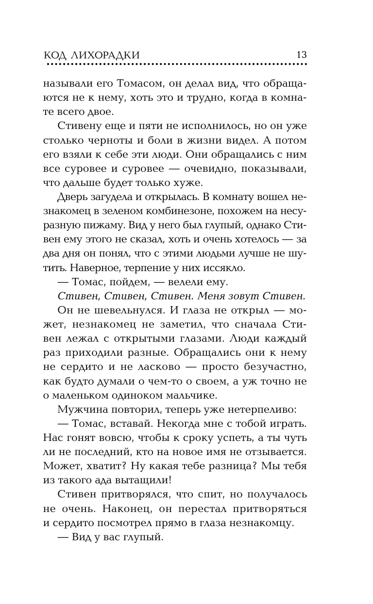 Книга прекрасная!!! Идеальный подарок на Новый год, для тех кто является фанатом трилогии «Бегущий в лабиринте». Эта книга 2 приквел, 1 приквел «Тотальная угроза». Не хочу спойлерить, но все же «Код лихорадки» это книга про то, что было до того, как Томас и все остальные попали в лабиринт. «Код лихорадки» - продолжение книги «Тотальная угроза». Поэтому,суть сюжета поймут только те, кто читал «Тотальную угрозу». Всем советую!!!! Книга-огонь!!!!