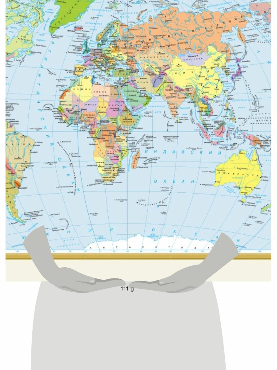 В этом картографическом издании, упакованном в тубус из пластика, представлены две географические карты. На одной стороне – политическая карта мира: здесь изображены все независимые государства мира с их столицами, а также зависимые территории и территории с особым статусом. На другой стороне – физическая карта мира, демонстрирующая распределение горных и равнинных территории на континентах Земли и чередование подводных хребтов, котловин и глубоководных желобов на дне Мирового океана. Отмечены крупнейшие вершины всех основных горных систем суши и максимальные глубины океана.