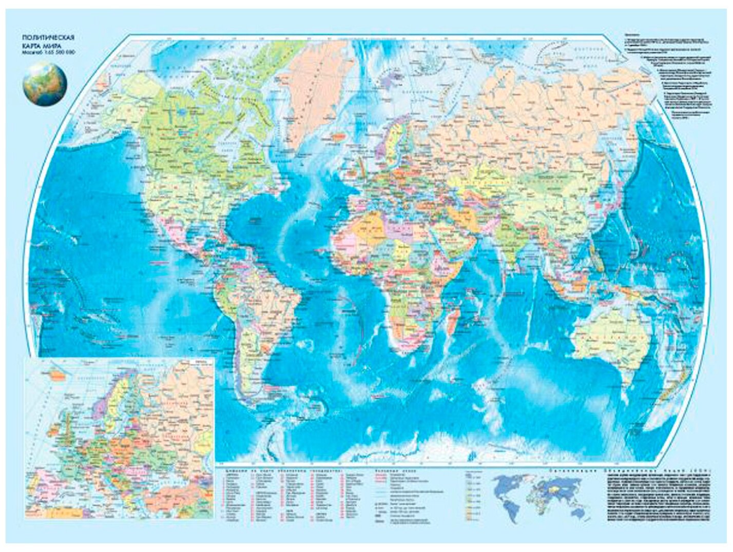 Двухсторонняя складная карта удобного формата. На одной стороне листа дана физическая карта мира масштаба 1:80 000 000, дополненная картами Арктики и Антарктиды, на другой стороне - политическая карта мира масштаба 1:65 500 000 с картой-врезкой Европы в масштабе 1:28 000 000.