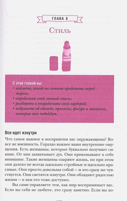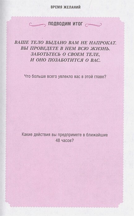 Такую книгу приятно держать в руках. Она не черно-белая, а с розовыми иллюстрациями. Есть отдельные страницы, чтобы записывать любимые цитаты, выводы и даже план на будущее.