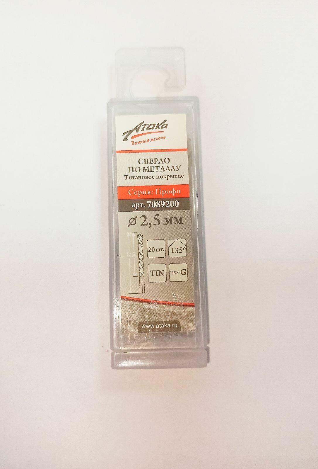 | Прочие особенности и свойства | Сверло по металлу 2,5 мм. титан-нитридное профи Атака, в боксе. Материал:инструментальная быстрорежущая сталь типа HSS-G с покрытием из нитрида титана, отличающаяся повышенной стойкостью, низким уровнем радиальных биений и снижением трения на нережущих поверхностях сверла. Подходит для сверления мягких и средних по твердости металлов, используется всеми типами дрелей и станков. Самоцентрирующееся острие с крестообразной подточкой снимает необходимость дополнительного накернивания и засверливания отверстий. Количество в упаковке:20 |