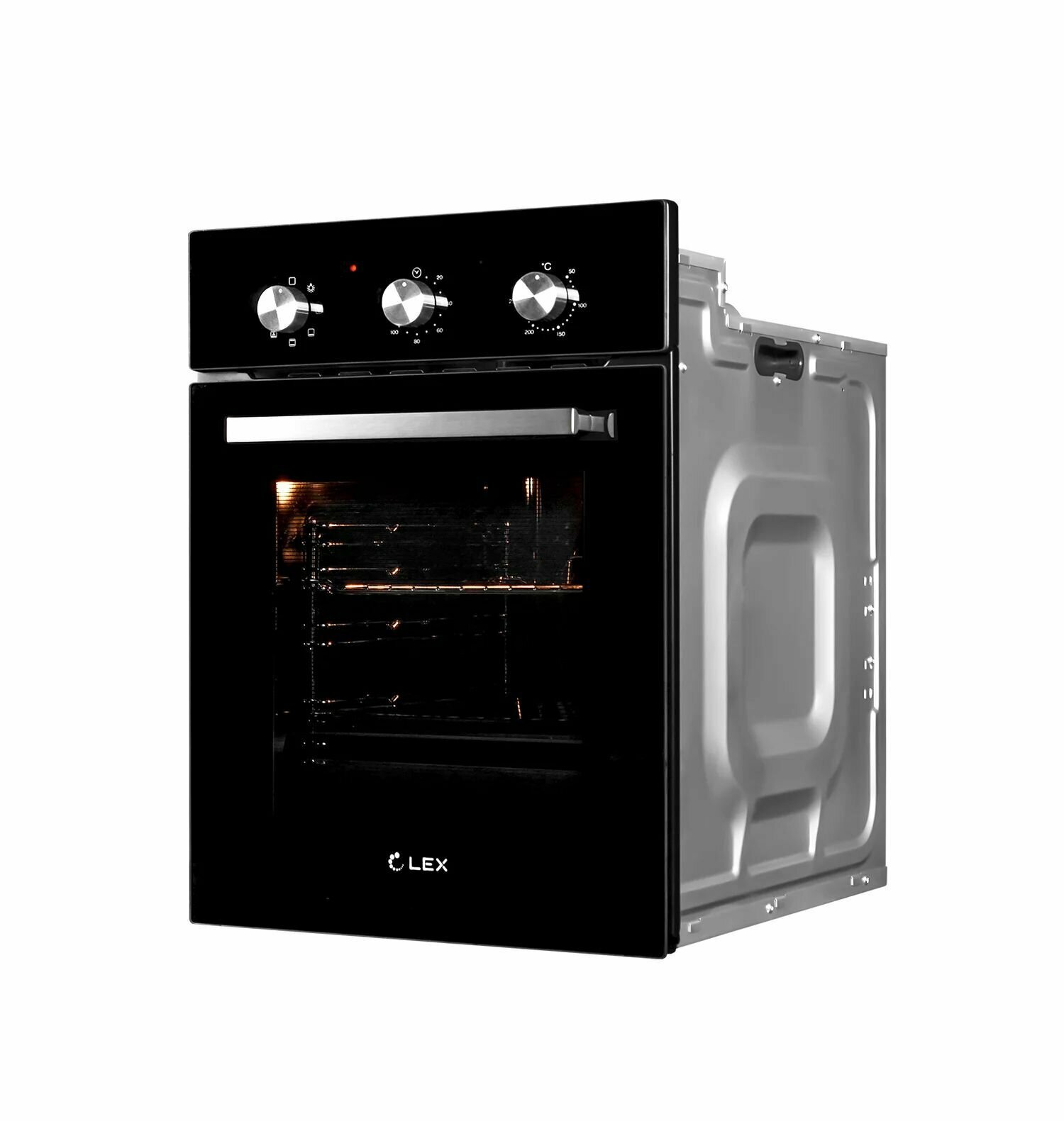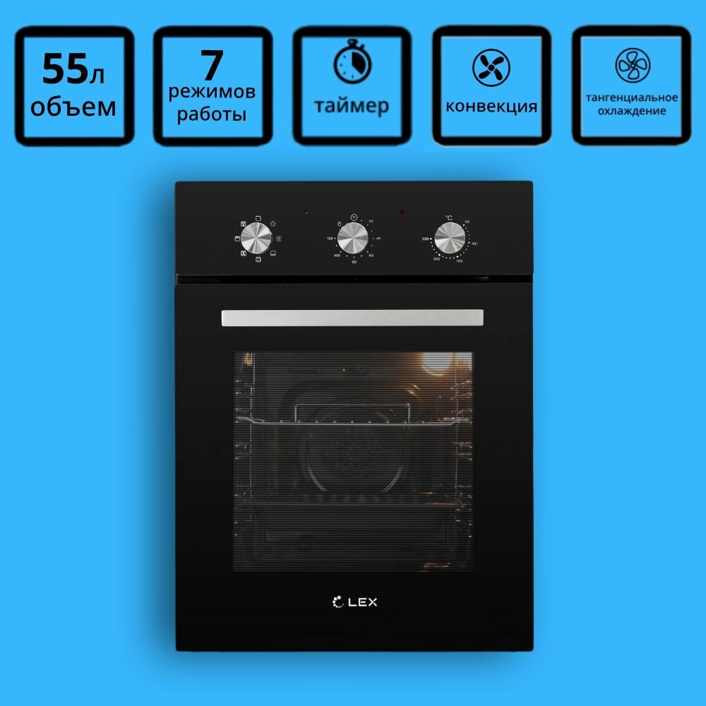 Духовой шкаф Lex стекло черное, электрическая духовка, объём 55л, покрытие: эмаль легкой очистки, электрический гриль, программ духовки: 7, независимое управление, переключатели поворотные