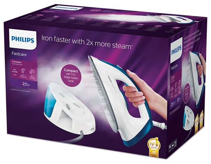 | Особенности | Возможность достижения максимального уровня пара за 2 минуты. Возможность добавления воды в любое время. Наличие носика Triple Precision позволяет полностью контролировать процесс. Наличие системы очистки от накипи со звуковым и визуальным напоминанием. Компактный размер и легкий вес утюга. |